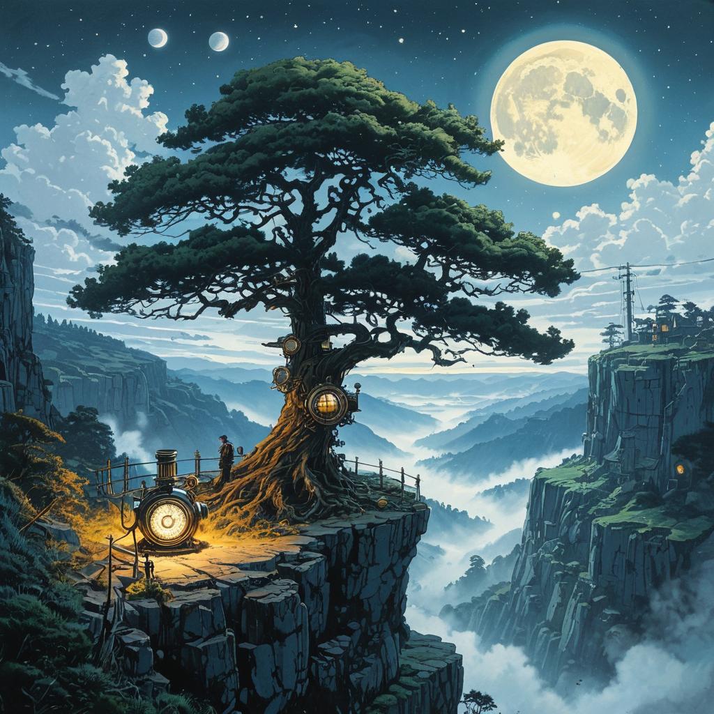 High-detail oil painting of a steampunk-inspired tree on the edge of a cliff overlooking a foggy valley. The scene features a large full moon and two smaller glowing moons in a starry night sky. The tree incorporates mechanical elements with glowing lights, blending nature with steampunk machinery. The artwork shows a figure standing by the tree, surrounded by rugged cliffs and distant mountains, influenced by manga and anime styles.
