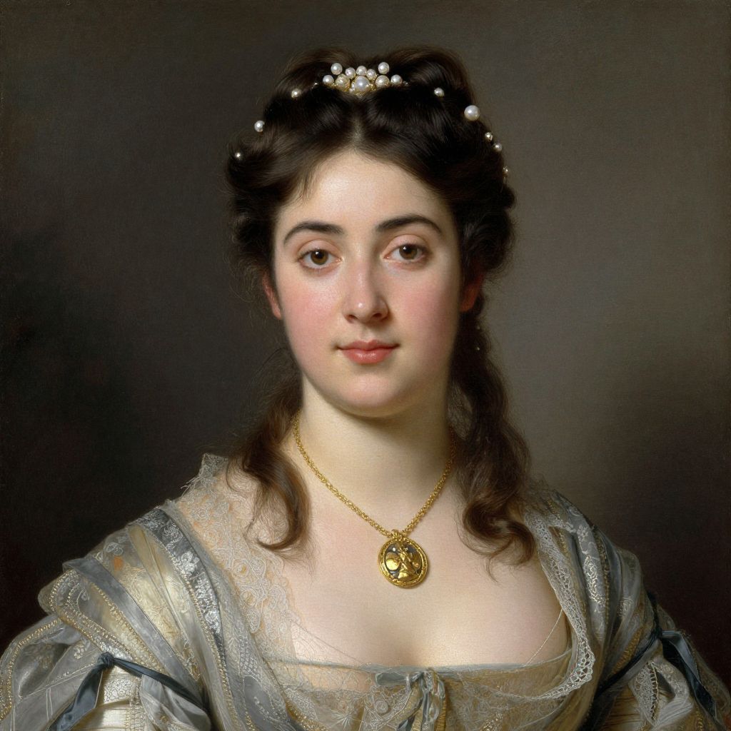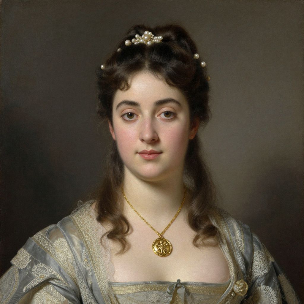 Portrait of a young woman with elegantly styled hair adorned with pearl-like accessories, wearing a delicate lace-trimmed dress and a gold necklace featuring a central medallion, painted by Pierre-Auguste Cot in 1869.