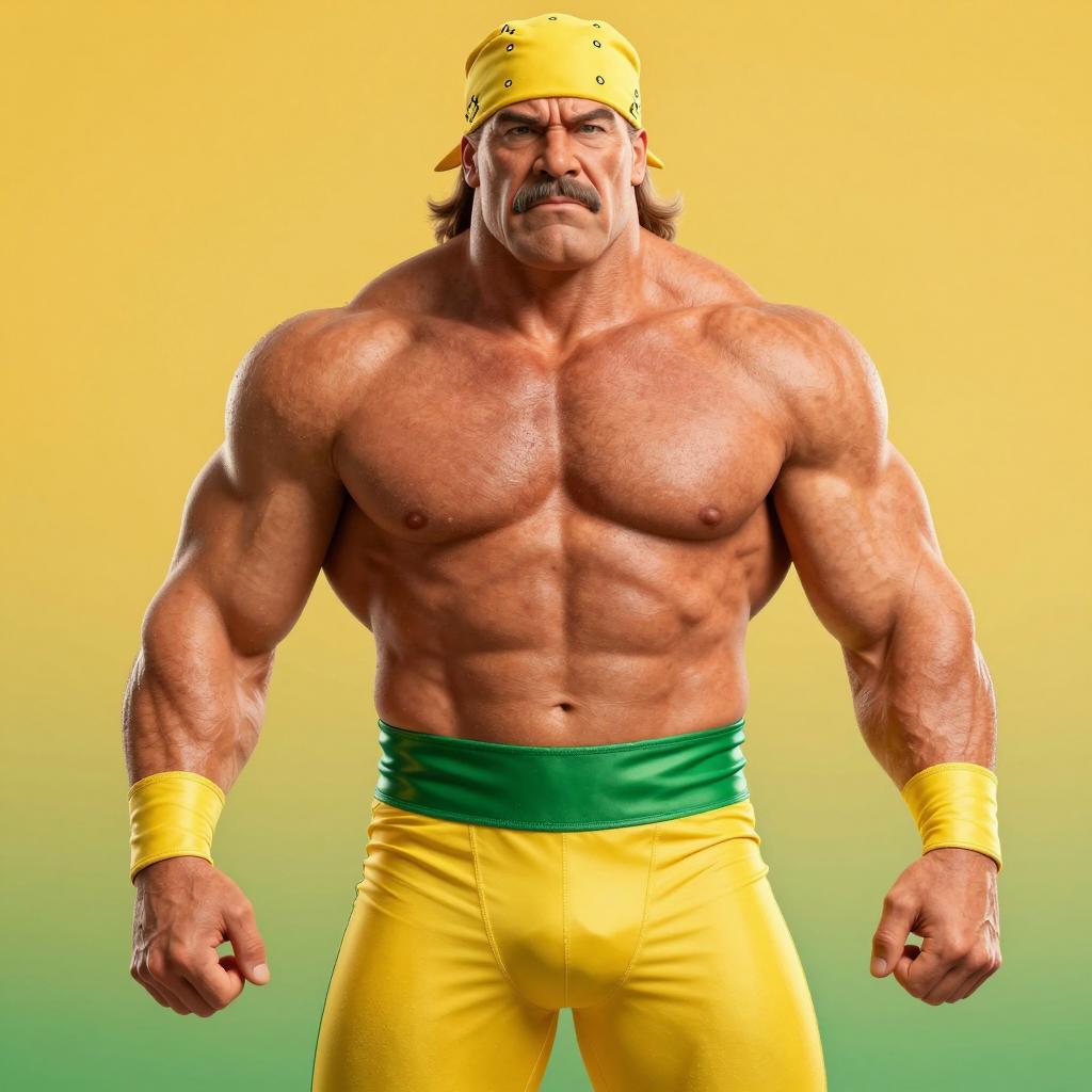 Wwe hulk hogan costume man, photorealistic, muscular older man, yellow bandana, yellow and green wrestling attire, yellow headband, yellow and green tight pants, bulging biceps, defined abs, tanned skin, serious expression, mustache, yellow and green background, standing pose, close-up, frontal view, high contrast, vibrant colors, 3D CGI, hyper-realistic style