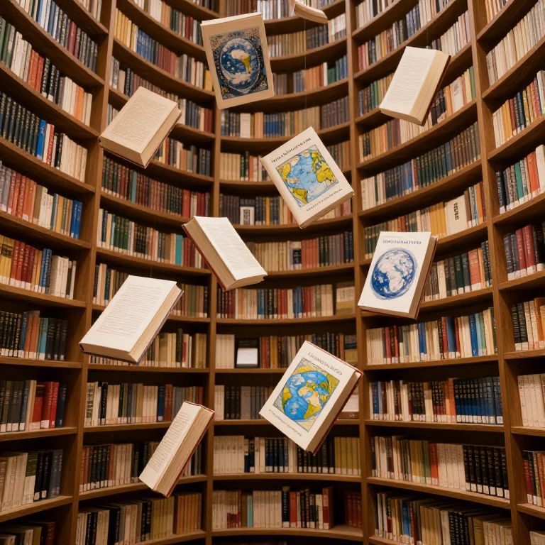 Photograph of floating books with globe illustrations above curved wooden bookshelves filled with multicolored books, creating a magical library scene.