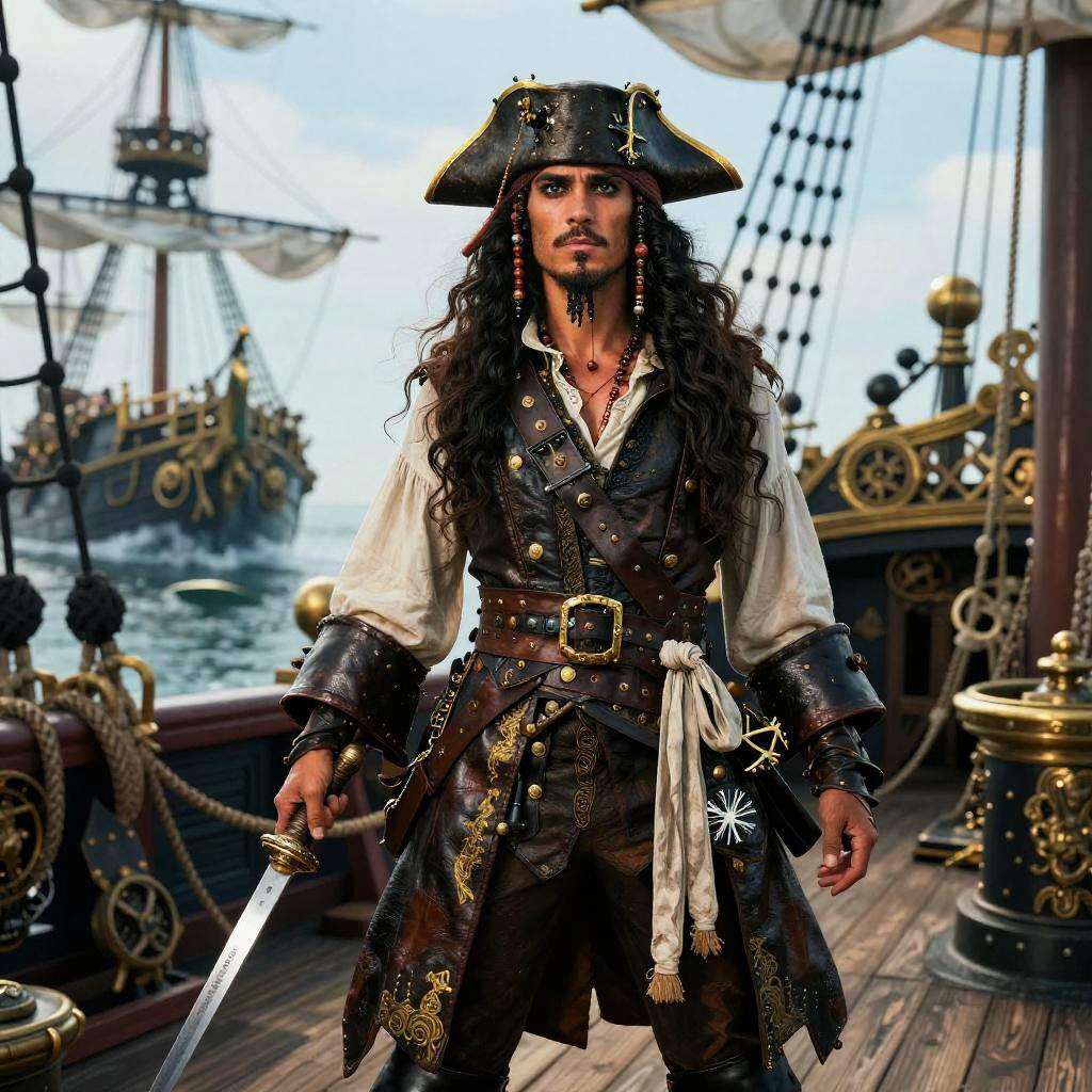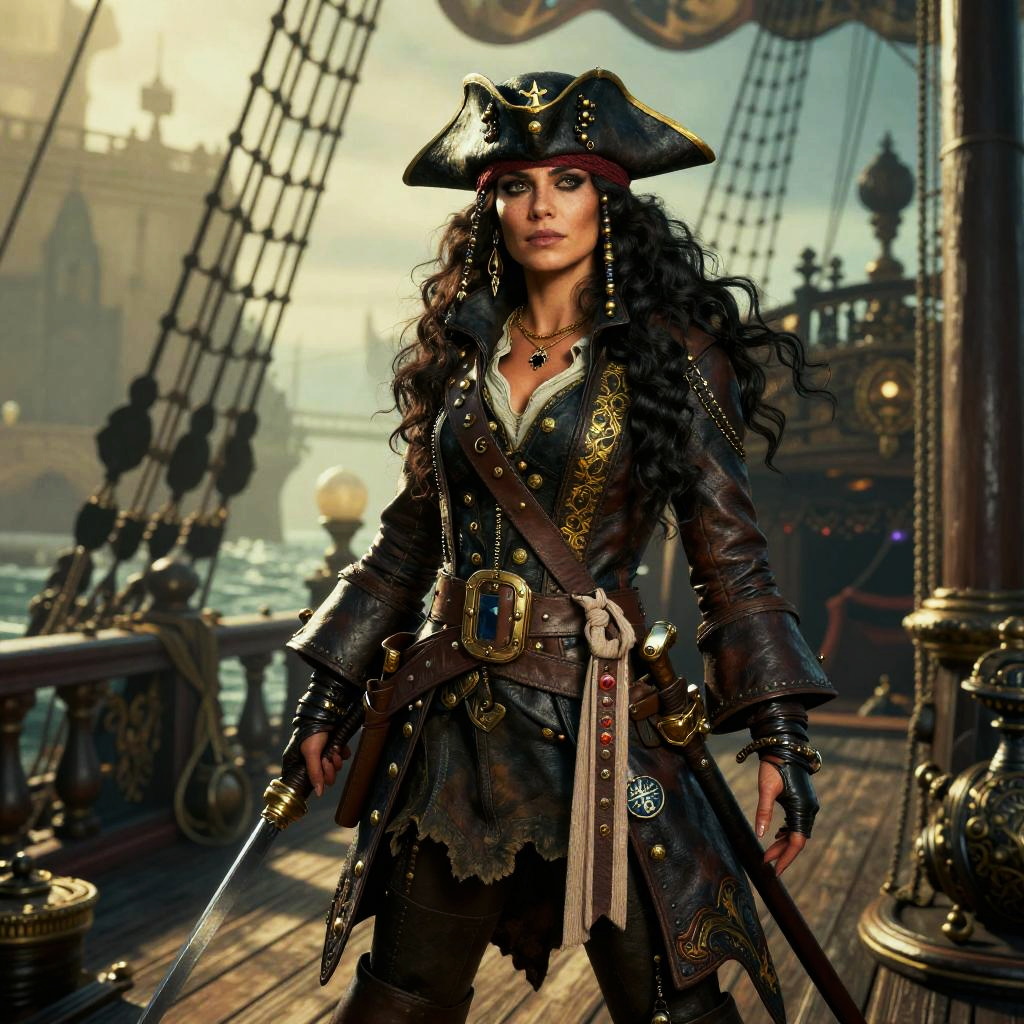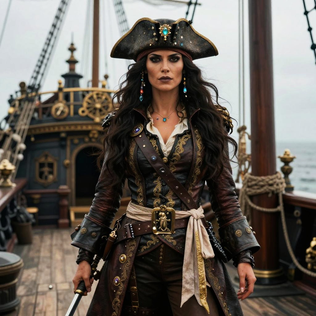 Tenacious marauder, pirate queen with long flowing dark hair, dressed in a detailed leather pirate coat with gold embroidery, standing on the deck of her ship at Siren’s Cove, known for shipwrecks