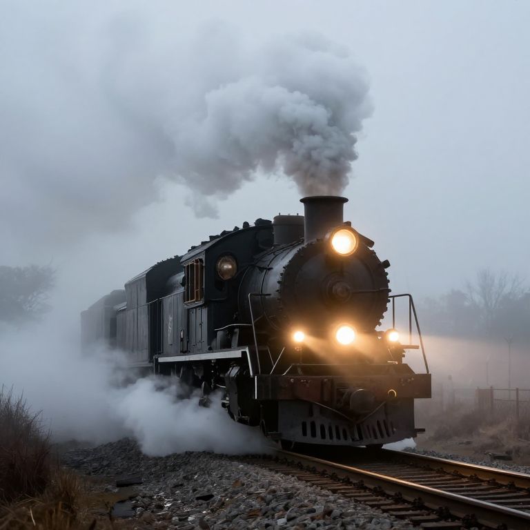 Steam billows from a vintage locomotive as its piercing headlights pierce through the dense fog, casting a warm glow along the railway tracks that stretch into the misty horizon.