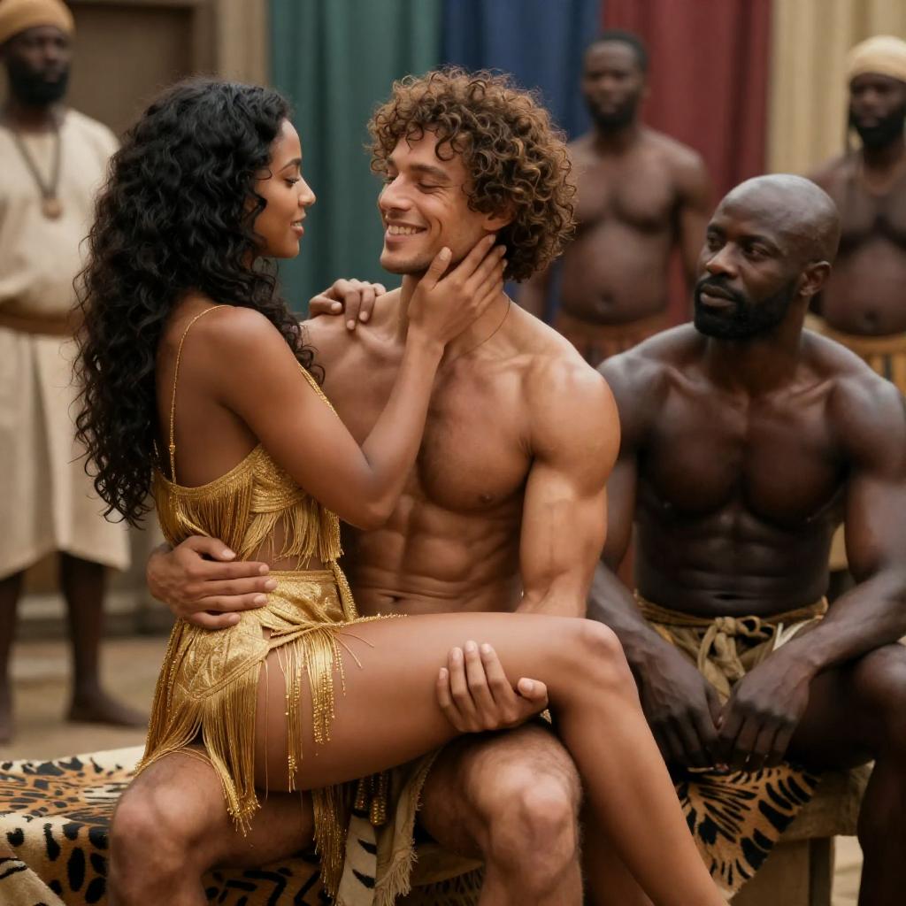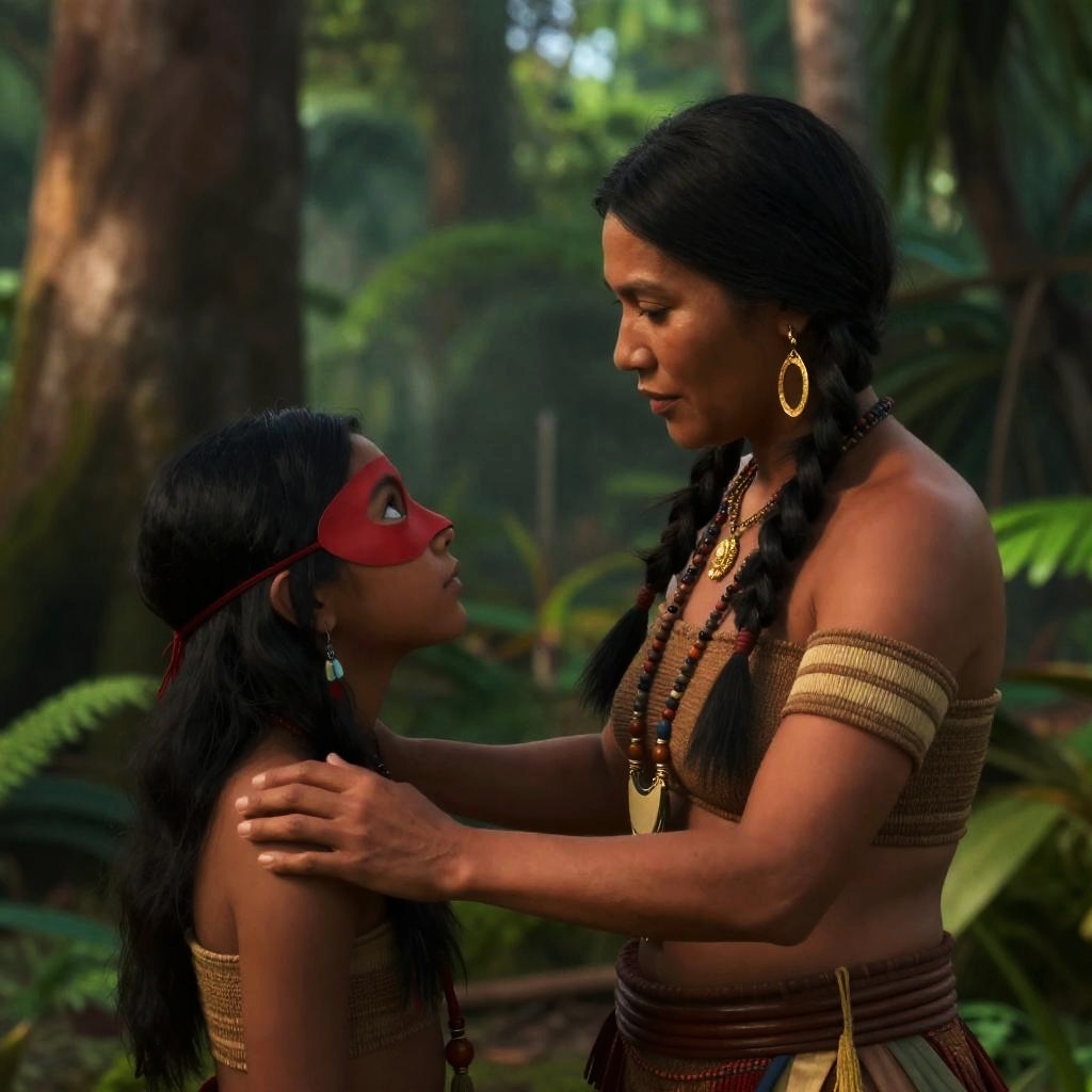 CGI scene of a muscular bald man with red tribal tattoos and a staff, facing a young woman with black hair, colorful tribal jewelry, and large eyes, kneeling on a sandy beach. Jungle huts and blue sky in the background. Man's intense gaze, woman's shy smile. Tropical setting with canoes on the shore.