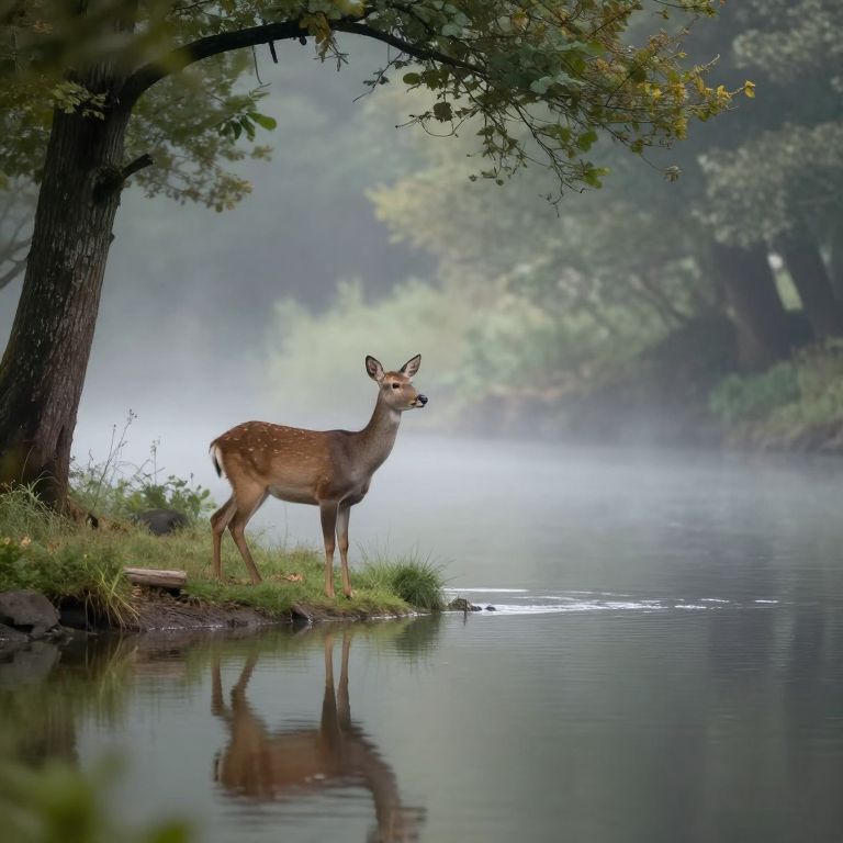 Serenity whispers through the misty forest as a deer stands poised at the edge of a tranquil river, its reflection mirroring the quiet harmony of nature, while the gentle ripples carry an unseen symphony of life, felt only by those who listen with their hearts.