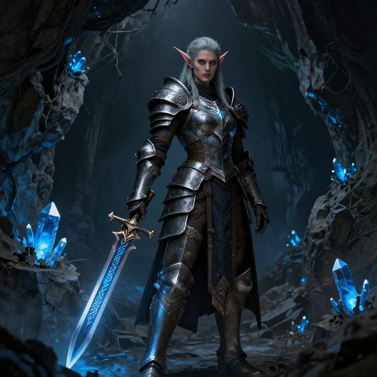Photorealistic digital artwork of a tall, muscular, silver-haired elf warrior standing in a dark, cavernous environment. The elf has pointed ears, a stern expression, and wears intricately detailed, dark metallic armor with blue glowing accents. He holds a large, ornate sword with a blue glowing blade in his right hand. The background features jagged rock formations and bioluminescent blue crystals, adding a mystical atmosphere. The lighting emphasizes the elf's armor and the sword's glow, creating a dramatic, fantasy-like scene.
