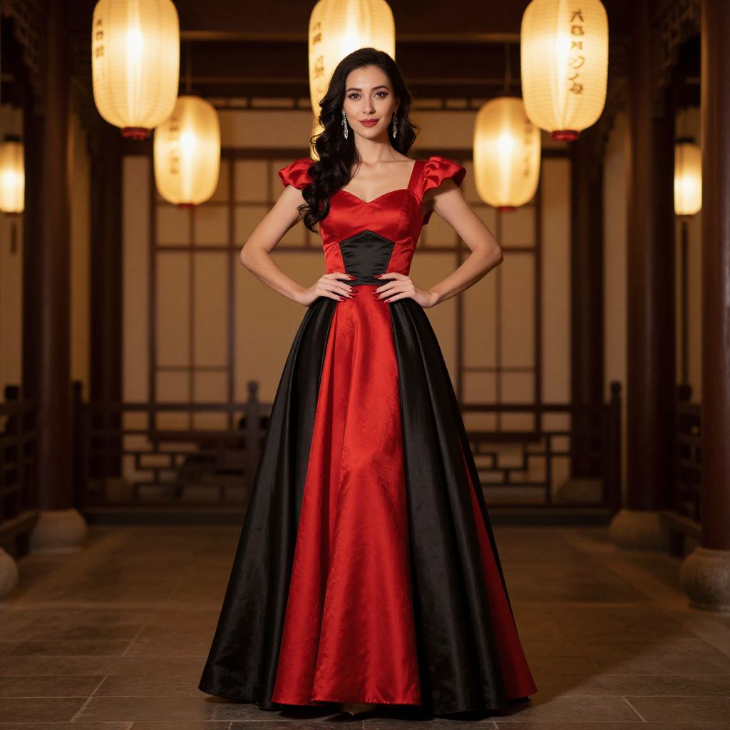 Photograph of a slender woman with long black hair, wearing a red and black satin ball gown, standing confidently in an Asian-style room with warm,