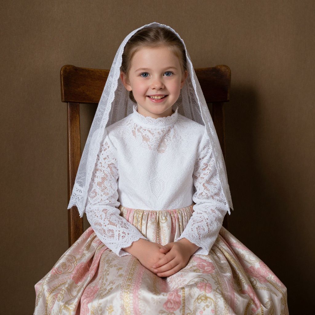 Photograph of a young girl sitting on a wooden chair against a brown wall. She has fair skin, blue eyes, and light brown hair tucked under a white lace veil. She is wearing a white lace long-sleeve dress with a high collar and an ivory, floral-patterned, full-skirted dress. Her hands rest gently on her lap, and she smiles softly at the camera. The texture of the lace is delicate and intricate, contrasting with the smooth, satin-like fabric of her skirt. The lighting is soft, highlighting her cheerful expression and the detailed patterns of her clothing.