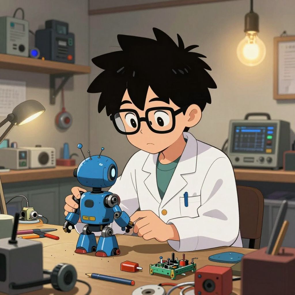 Digital illustration of an anime-style young boy with black spiky hair and large black glasses, wearing a white lab coat, focused on assembling a small blue robot on a cluttered wooden desk. The background features a workshop with shelves holding electronic equipment, a lit light bulb, and a calculator. The desk has various tools, a microscope, and colorful blocks. The boy's expression is concentrated, with a small blue "I" on his coat. The room has a cozy, slightly cluttered atmosphere, with soft, warm lighting.