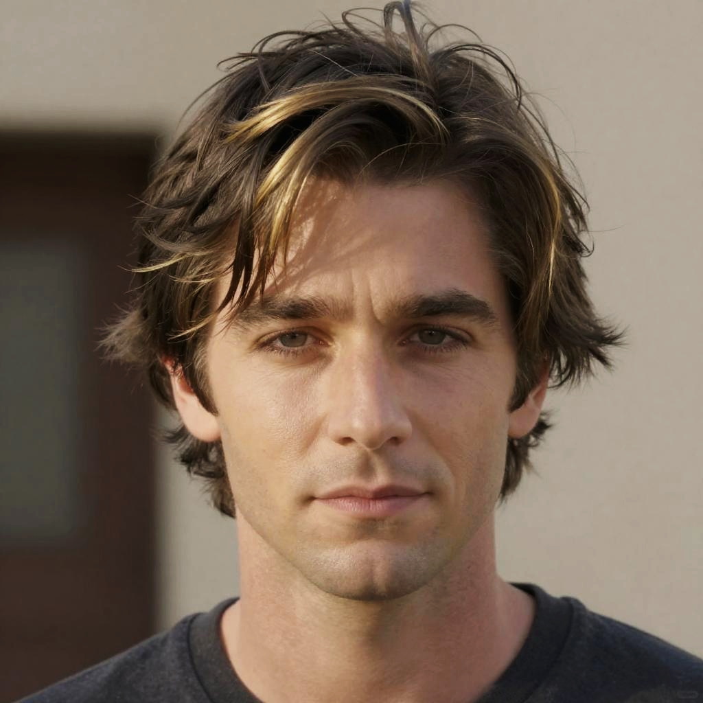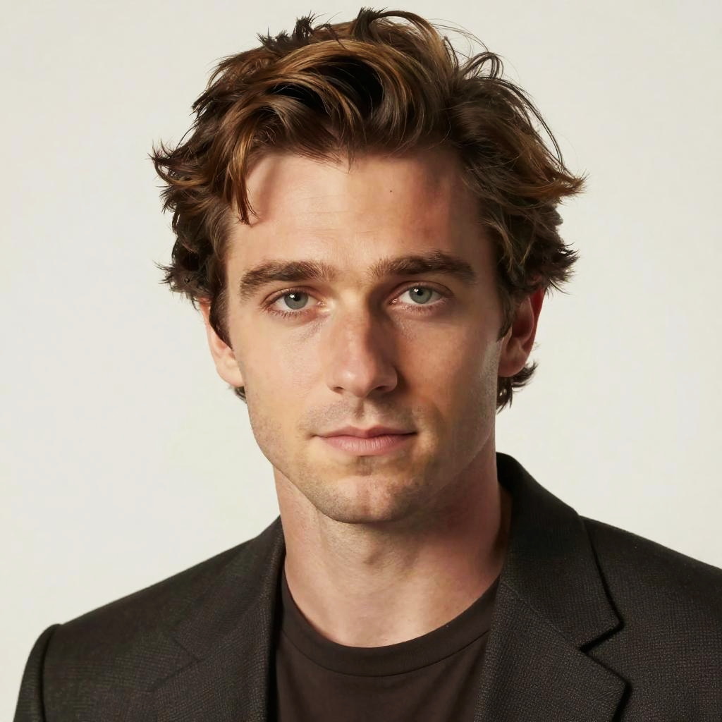 Hayden Christensen hair color showcased in medium brown shades with soft chestnut highlights, classic slightly messy hairstyle, studio lighting emphasizing hair texture, lifelike illustration