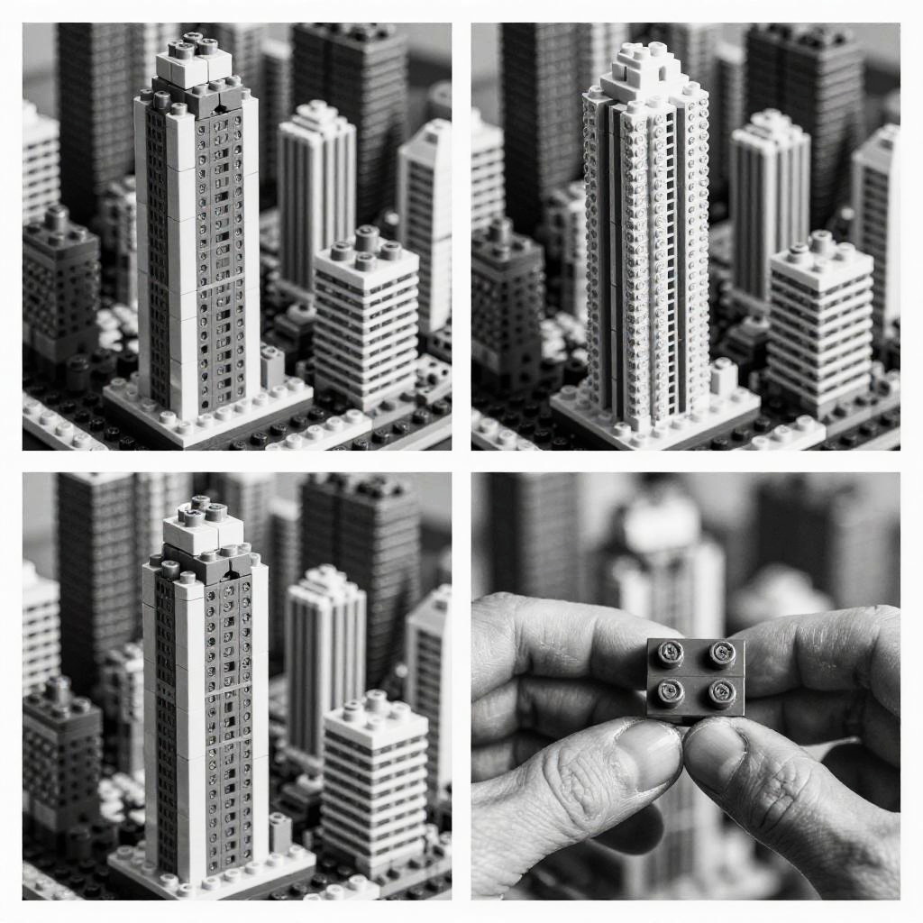 This image is a black-and-white digital collage featuring four close-up shots of a highly detailed LEGO cityscape. The top two panels show a dense cluster of towering skyscrapers with intricate textures and patterns. The bottom two panels focus on a hand holding a LEGO brick, partially obscuring the cityscape. The image has a high-contrast, gritty style, emphasizing the detailed LEGO architecture.