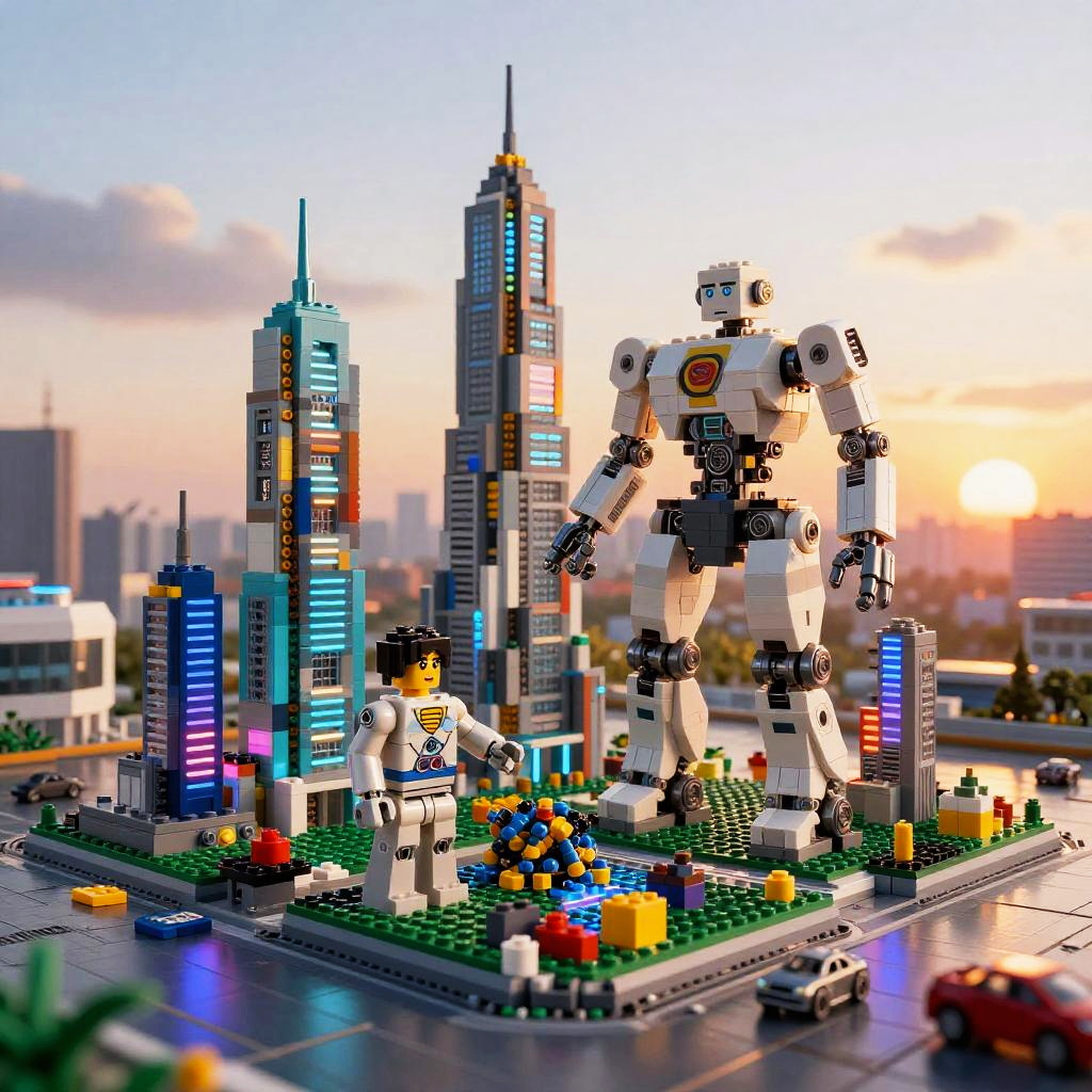 Photograph collage of LEGO cityscape with detailed high-rise buildings, close-up of hand inserting LEGO pieces, monochrome, high contrast.