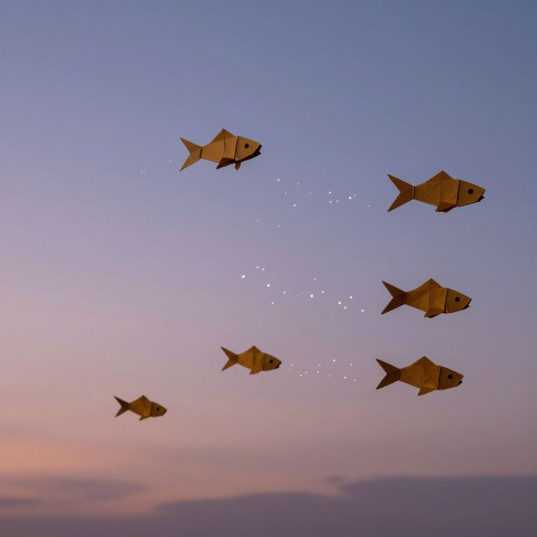 Giant gliders made entirely of folded origami fish soar silently across a twilight sky, leaving trails of shimmering koi ink in their wake.
