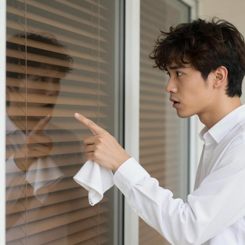 Young Asian man with dark, shaggy hair wearing a white button-up shirt, holding a white cloth in his right hand, pointing and looking with surprise or concern through a glass door with brown blinds behind it. The scene is indoors with reflections visible on the glass.