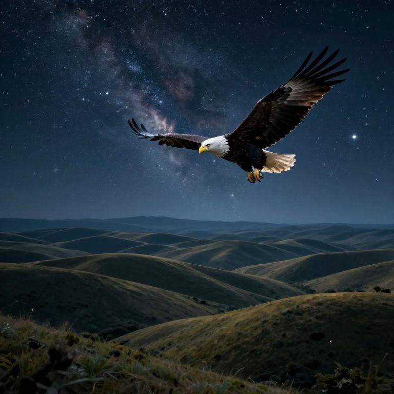 A majestic bald eagle soars under a starry night sky, with the Milky Way visible, over rolling hills. Photograph.