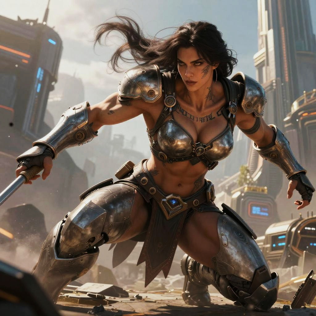 Huge muscle girl, epic fantasy warrior, wearing futuristic armor, glowing tattoos, sci-fi cityscape background, dynamic action pose, dramatic lighting, high detail, digital art style