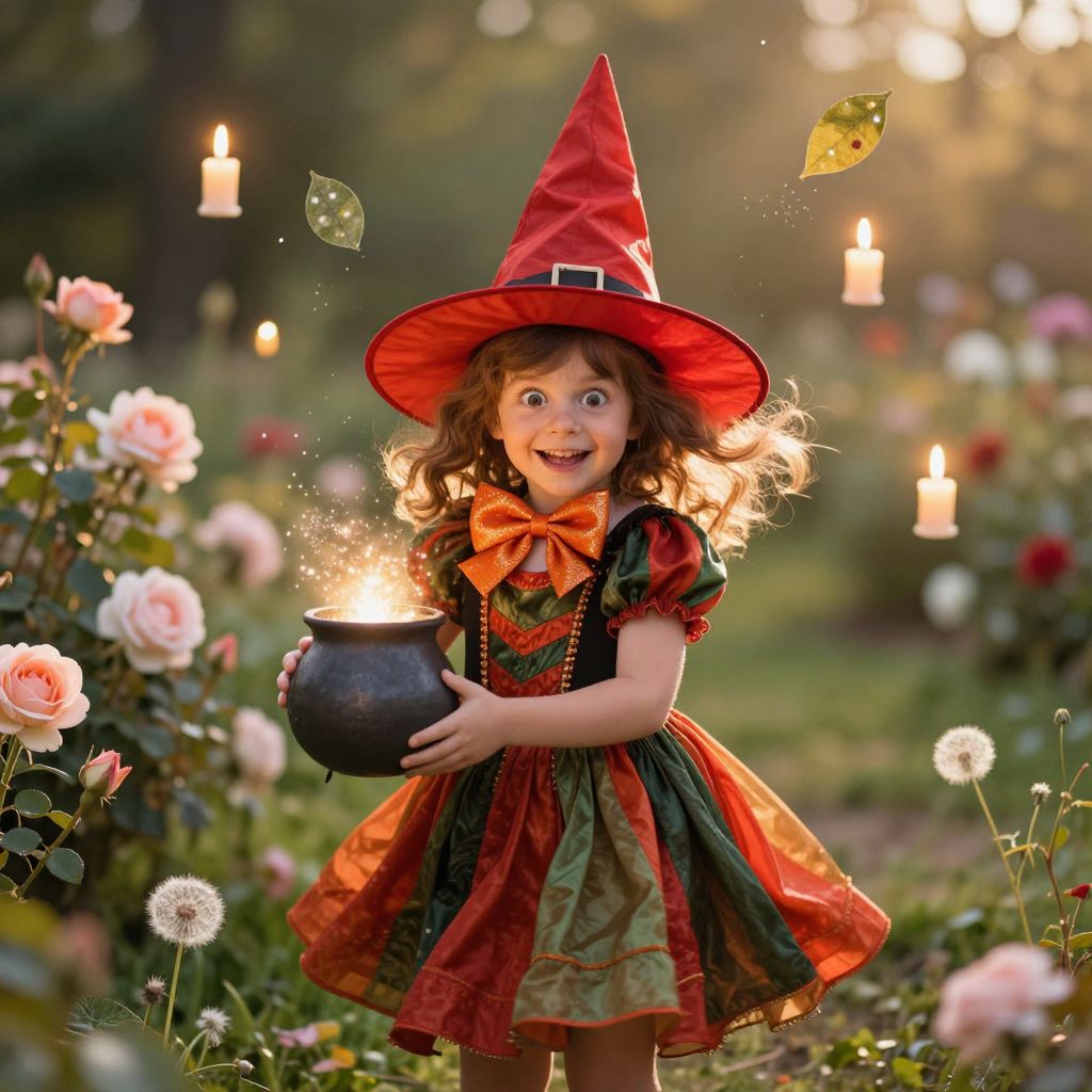 A small child dressed in a whimsical witch costume with a pointed red hat adorned with a shimmering orange bow tie, curly brown hair bouncing slightly in the breeze, standing in a sunny, flower-filled backyard with blooming roses and dandelions, holding a tiny, glowing cauldron in one hand while smiling mischievously with wide, sparkling eyes; the child is wearing a vibrant red and green striped dress that flutters gently in the warm afternoon wind, surrounded by floating, softly glowing candles that drift like fairy lights in the air, and a few enchanted leaves with faint magical sparkles gently drifting upward, creating a dreamy, magical atmosphere full of wonder and playfulness.