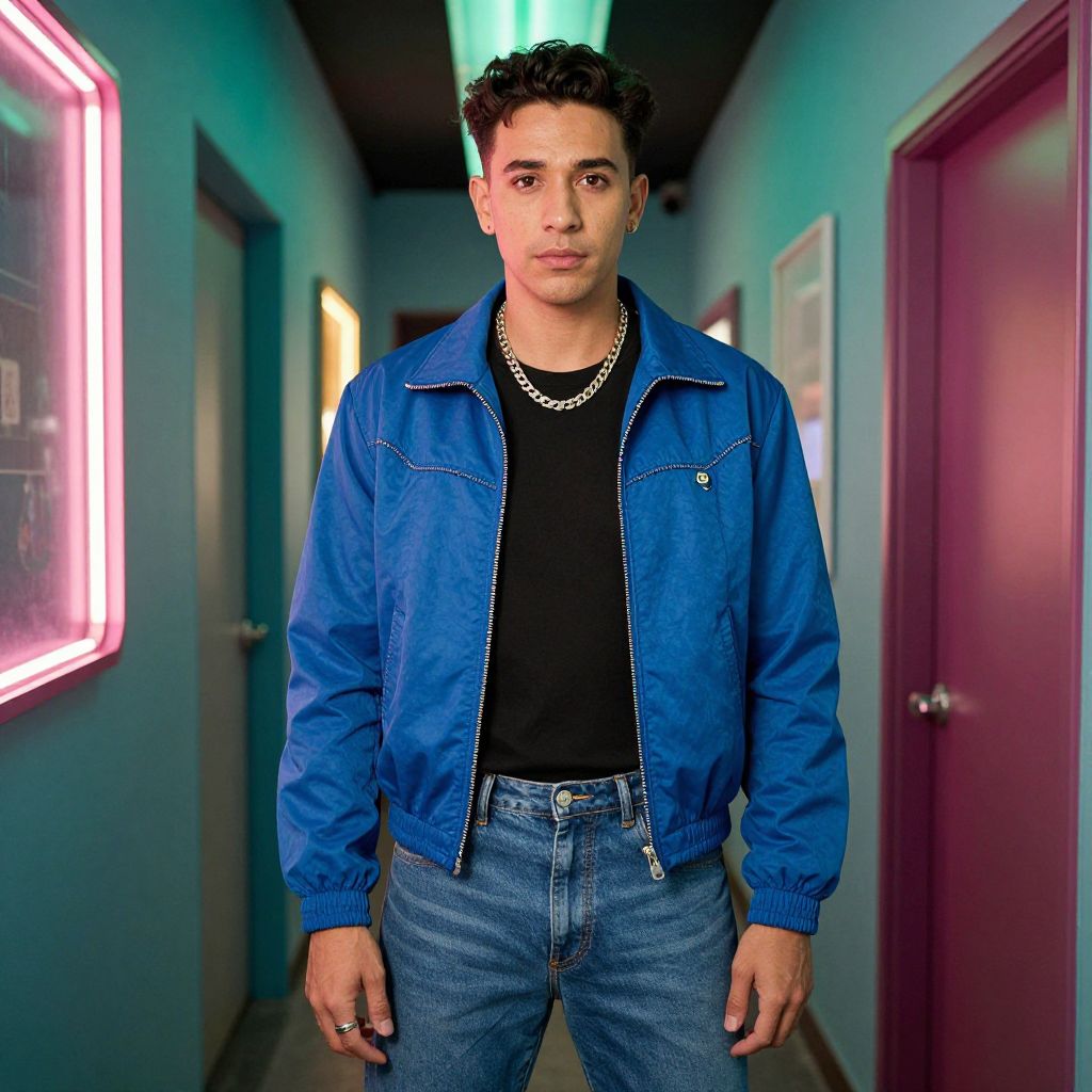 Retro Disco Outfit, a man in a blue jacket standing in a hallway with neon lights
