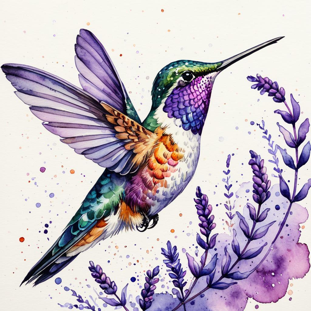Colourful watercolour painting of a dreamy lavender hummingbird, vibrant swirls, high quality, watercolour, dreamy, vibrant, colourful, lavender, artistic, whimsical, dreamlike, detailed feathers