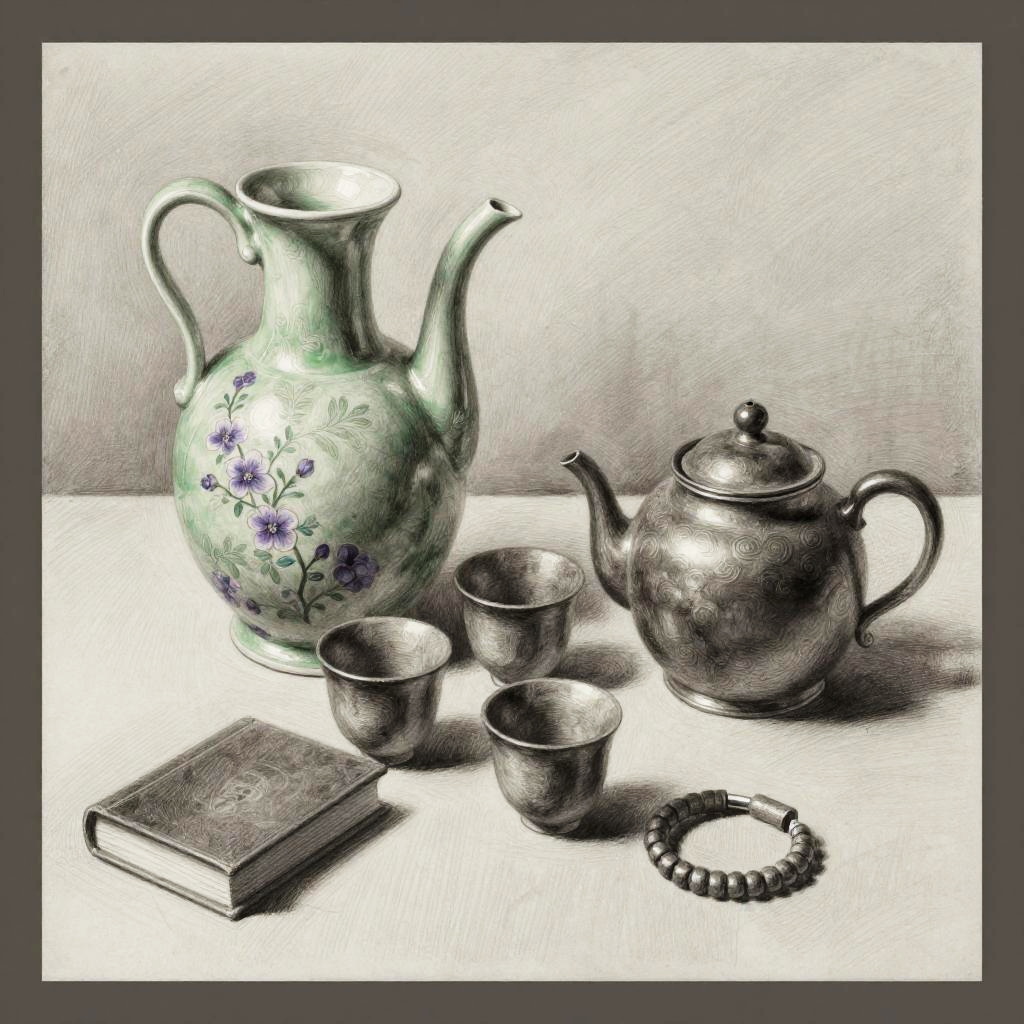 This is a realistic pencil rendering of a decorative still life featuring a classic jade green porcelain jug with tiny violet blossoms on the left, three rustic ash gray ceramic cups in the center, and a dull pewter teapot with patterned relief on the right. A small book and a coiled bracelet sit in front, with gentle highlights and soft shadows to suggest depth. The background is a smooth soft dove gray plastered wall, and the whole scene is framed with a dark brown border. Emphasize cozy tones, crisp edges, subtle surface texture, and calm, balanced composition.