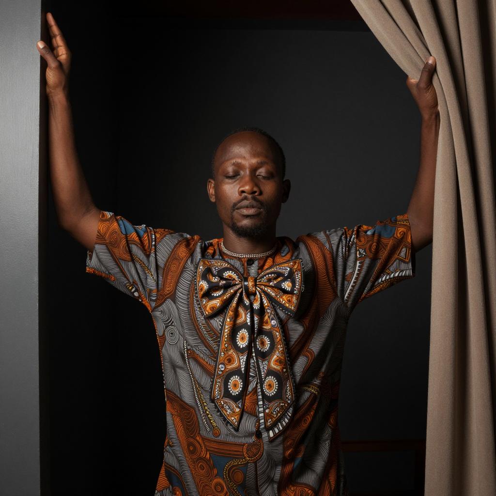A dark-skinned man with a featureless face, wearing a patterned shirt with a large, ornate bow, stands in a dimly lit room. He raises both arms, gripping a curtain on the right and a door frame on the left.