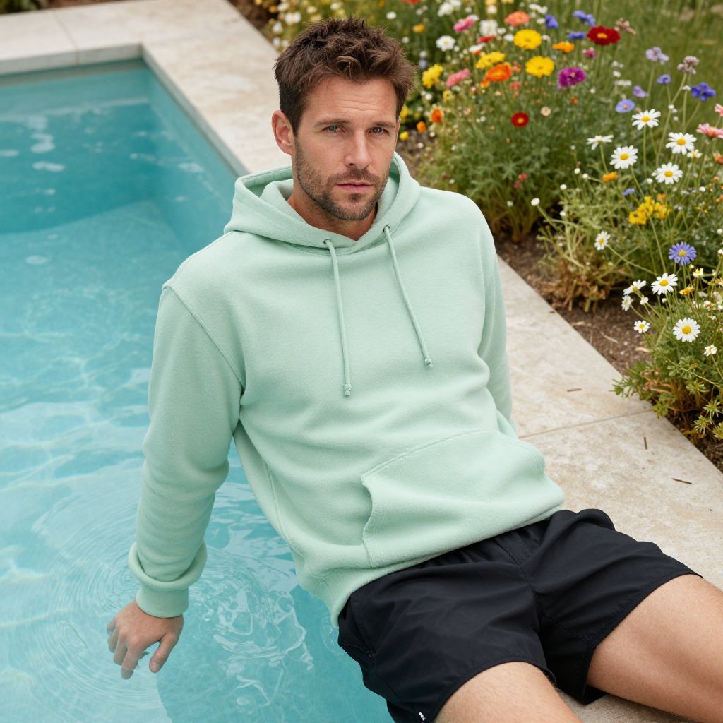 A man, soft terry cloth sleeveless hoodie, pastel green, solid black swim shorts, relaxed fit, moisture-wicking material, hidden grotto, shimmering pool, vibrant wildflowers, lithographic film style, relaxed expression, enjoying the serene surroundings. Man has masculine face and piercing eyes