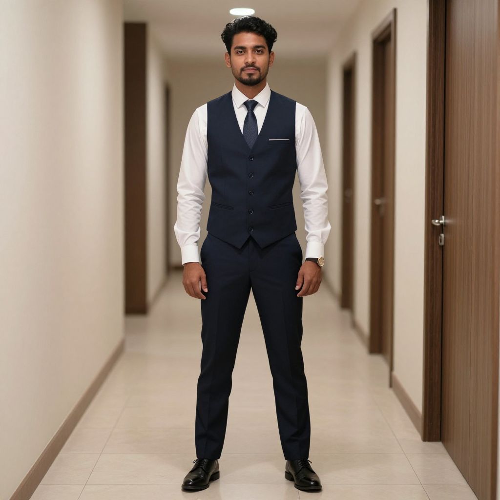 Photograph of a young South Asian man standing in a brightly lit, narrow hallway with white walls and wooden doors. He has a medium brown complexion, short curly black hair, and a trimmed beard. He wears a white dress shirt, black waistcoat, black tie, and black trousers, paired with black dress shoes. His stance is confident, with hands relaxed by his sides. The hallway has a polished tile floor and a ceiling with fluorescent lights, creating a clean and professional atmosphere. The man's attire and demeanor suggest a formal or business setting.