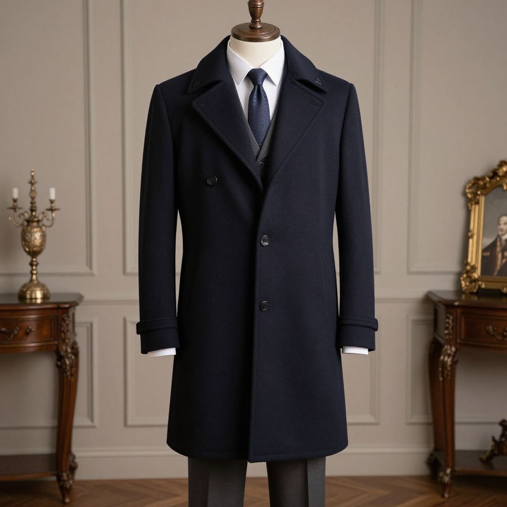 Photograph of a dark navy, double-breasted overcoat displayed on a headless mannequin in an elegant, vintage-style room. The coat features black buttons and is worn over a white dress shirt with a black tie. The background includes two dark wooden tables with ornate carvings, one holding a brass candelabrum and the other a gold-framed mirror. The walls are painted a soft beige with decorative molding. The mannequin stands on a polished wooden floor, centered in the image. The overall setting exudes a classic, sophisticated atmosphere.