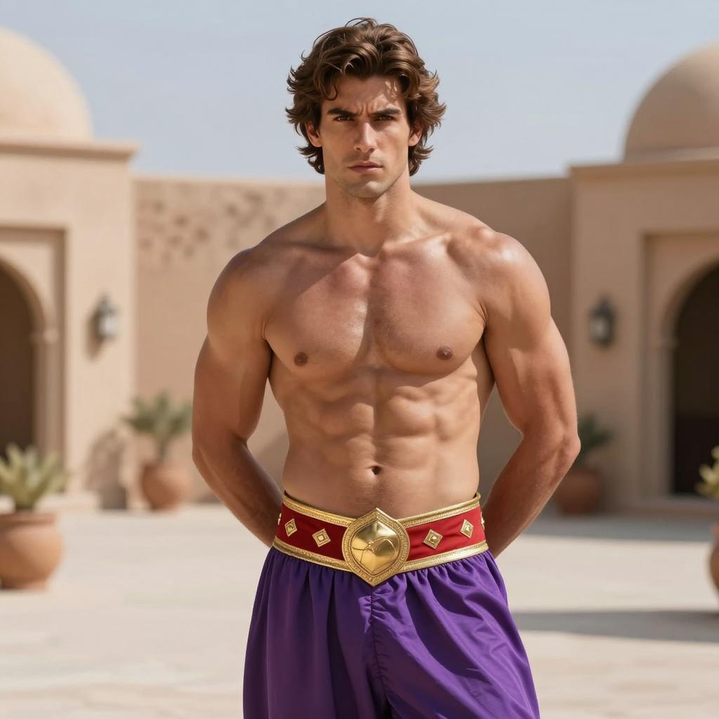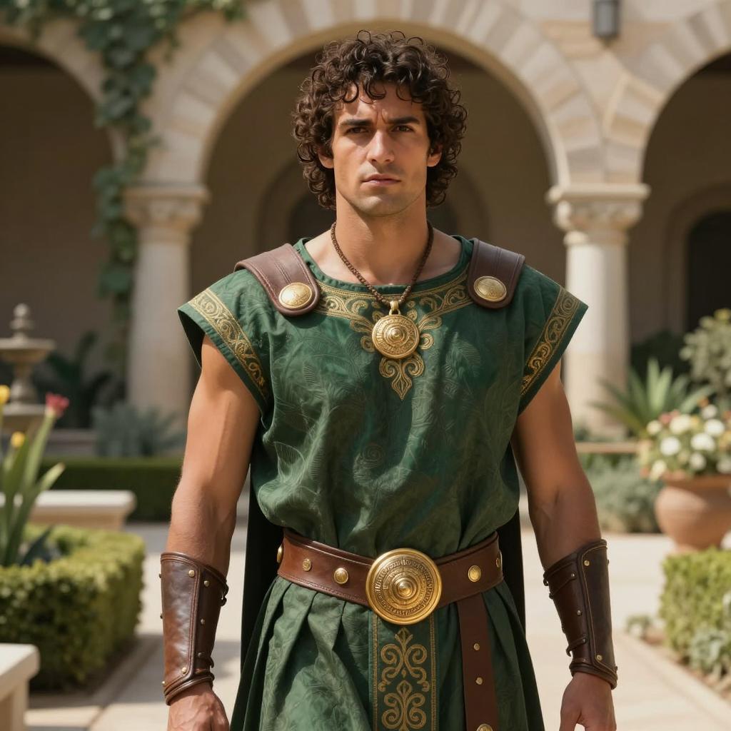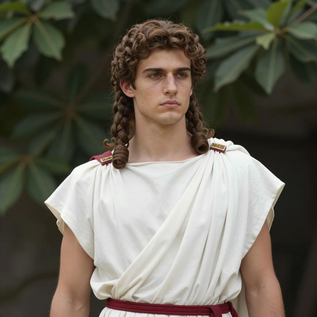 Power male cosplay, photograph of handsome young man, medium-length dark brown hair, looking to the side, wearing ancient Greek-inspired outfit, white shirt with gold and red accents, red suspenders, white pleated skirt, red and gold arm bands, belt with round buckle, standing outdoors, blurred stone wall and greenery in background, natural light, realistic style, cinematic quality, detailed clothing ures, attractive and confident appearance, slightly tanned skin tone