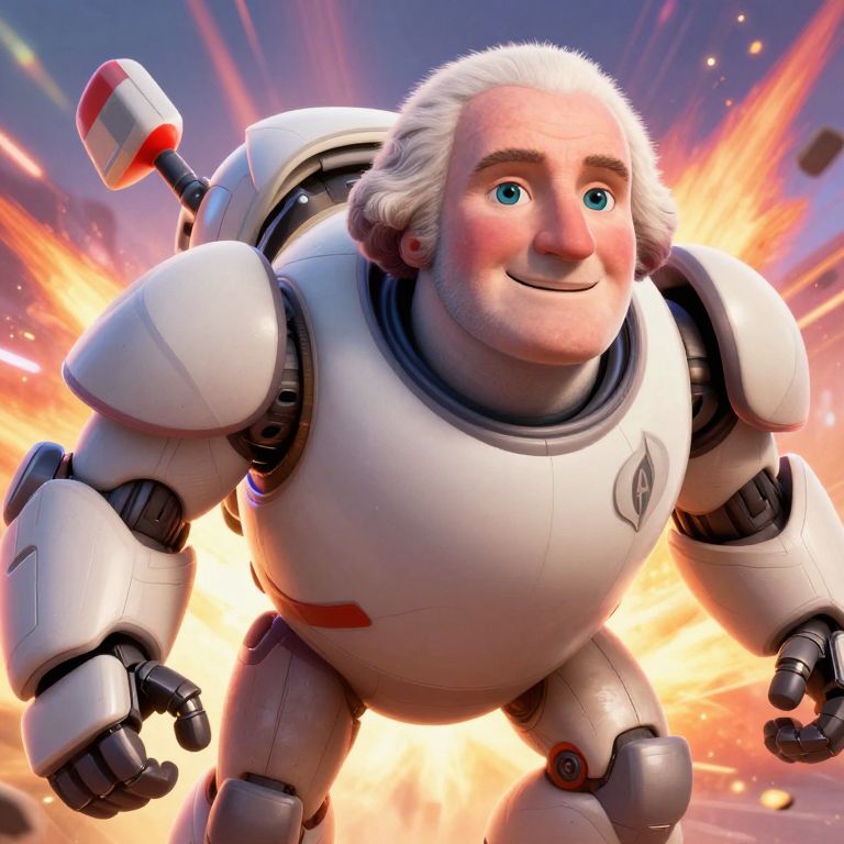 A close up of president george washington smiling to the camera, controlling a personal attack mech, by pixar, exciting illustration, explosive colors, trending on artstation