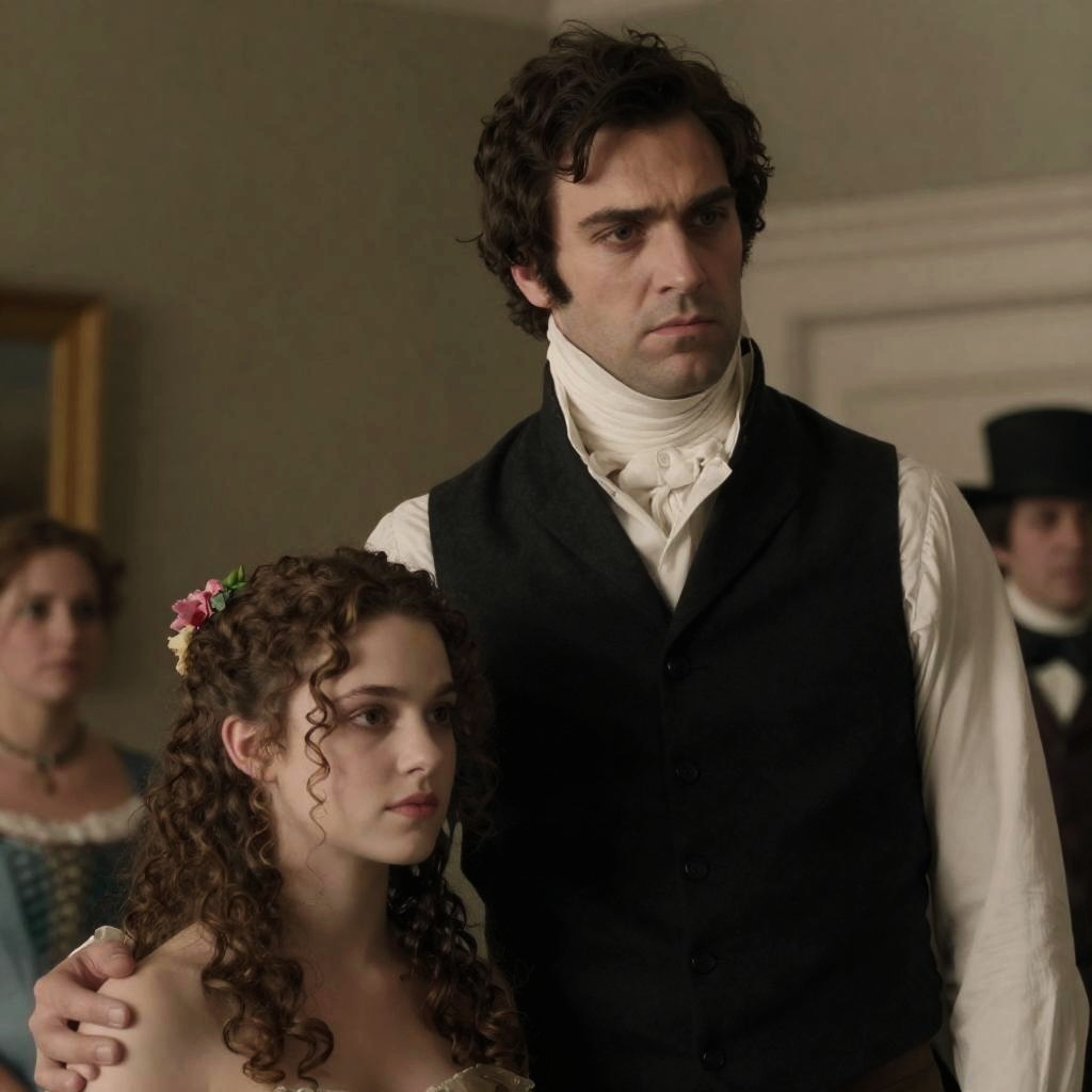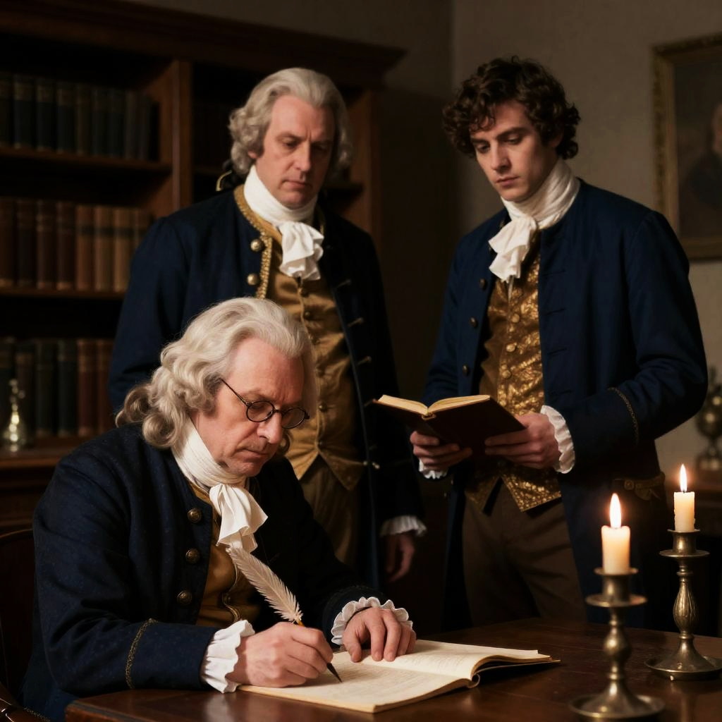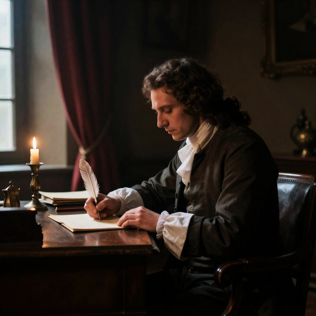 Man in 18th-century brown coat and waistcoat, pointing with right hand, standing at table with candle, feather, and papers. Background: six people seated at green-covered tables, dimly lit room with large windows. Man has short dark hair, white ruffled shirt, intense expression. Candlelight and wooden chairs visible.