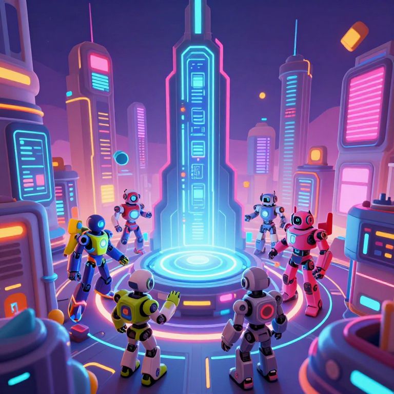 A vibrant, digital CGI illustration depicting a futuristic neon-lit cityscape with six colorful, humanoid robots in the foreground. The robots, each with unique designs and bright color schemes like green, blue, red, and white, are positioned around a glowing, circular platform at the center. The background features towering buildings with illuminated, vertical neon signs in pink, blue, and orange. The scene is dynamic, with the robots appearing to be in a mid-action pose, suggesting a battle or gathering. The overall style is reminiscent of cyberpunk aesthetics, with bold, contrasting colors and sleek, futuristic designs.