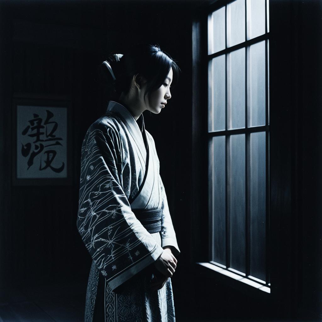 A noble psion, expressing quiet contemplation, wearing a sleek tunic with ethereal patterns, standing against a minimalist chamber shielded from the outside world, drawn in the dark and emotional style of Hajime Isayama.