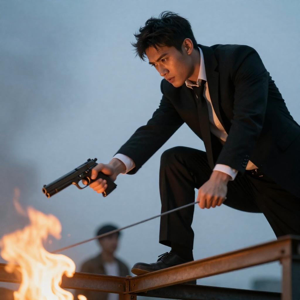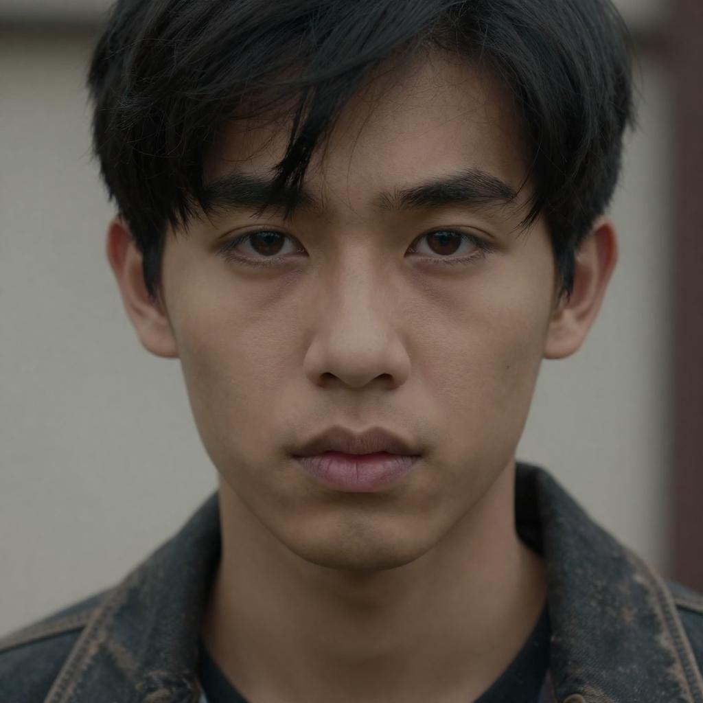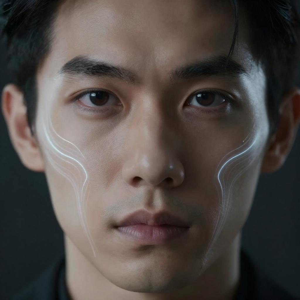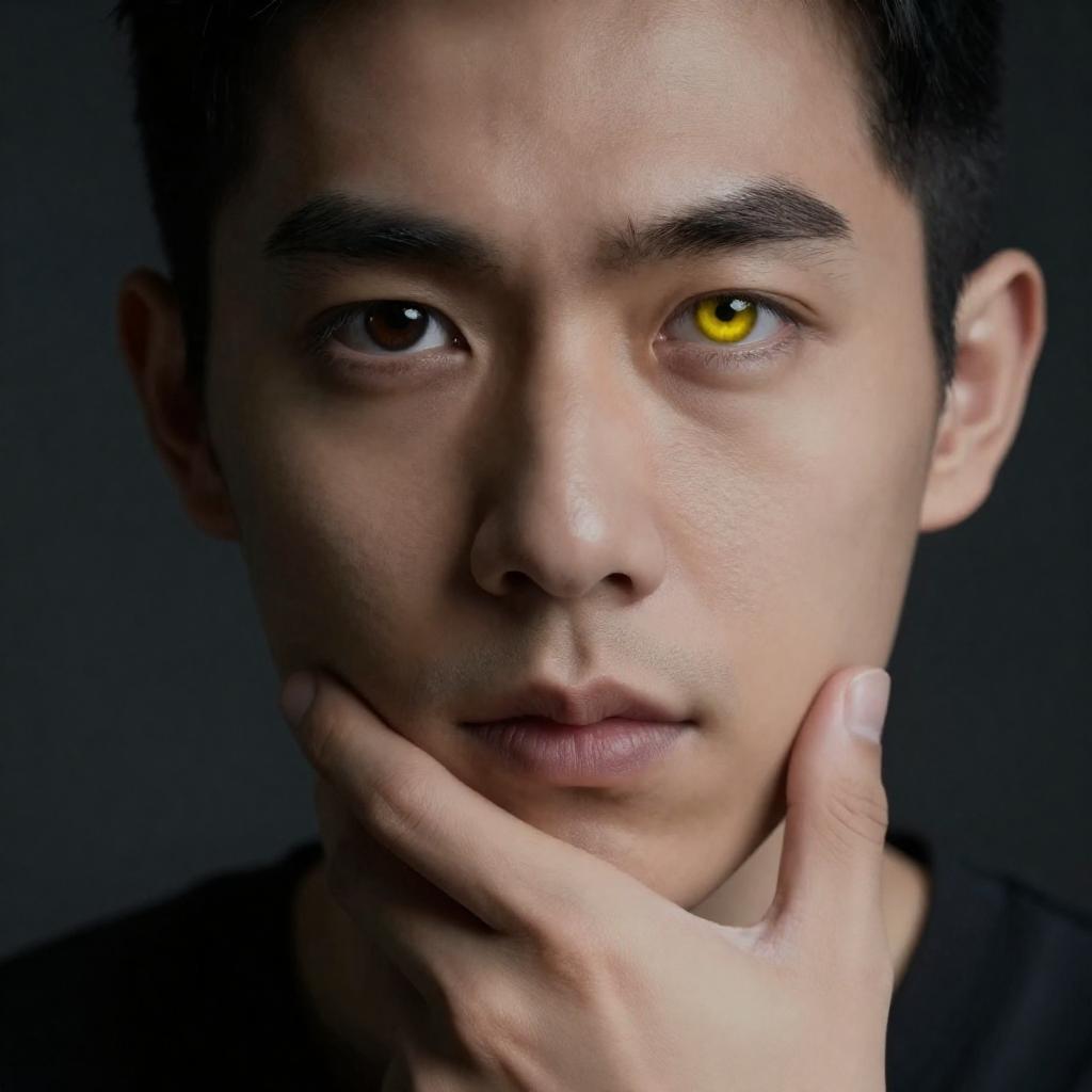 Close-up portrait of an Asian man with intense red glowing eyes, slightly red-tinged skin illuminated by the red light. The subject has dark hair and eyebrows, neutral expression, and a dark blurred background.