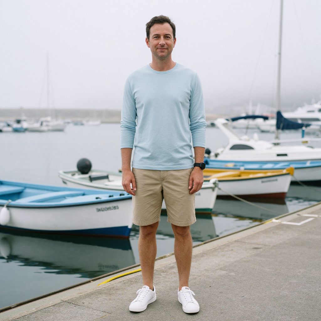 "a man, pastel blue crew neck shirt, khaki shorts, classic white tennis sneakers, soft cotton blend, fresh and casual vibe, foggy morning, quiet harbor, colorful boats lined up, Ilford film stock, relaxed smile, serene atmosphere. Man has masculine face and piercing eyes"