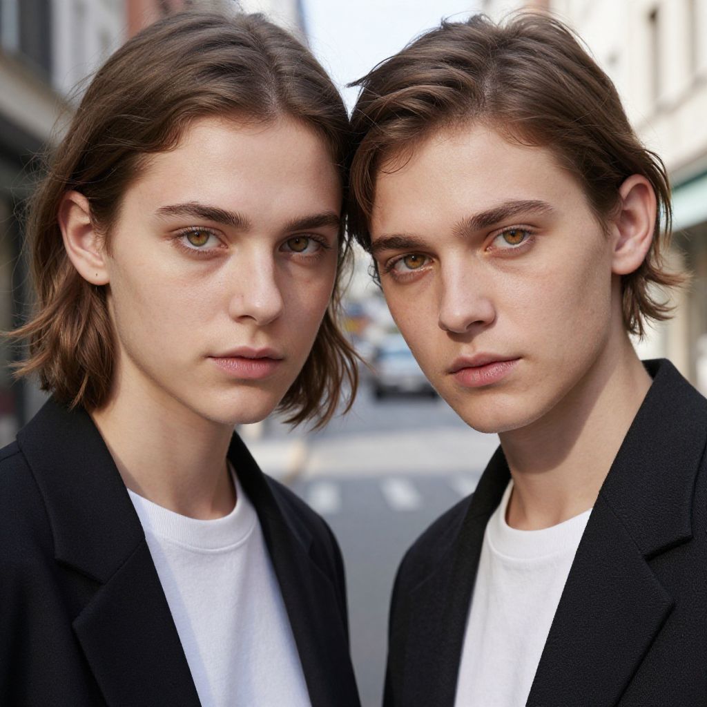 Photograph of two young Caucasian men with pale skin, shoulder-length brown hair, and green eyes, standing close together in an urban setting. Both wear black blazers over white t-shirts and have serious, slightly pouty expressions. The background shows blurred buildings and a street, suggesting a city environment. The lighting is natural, highlighting their facial features and hair texture. The image has a slightly stylized, almost CGI-like quality, with sharp focus on the subjects and a soft, blurred background.
