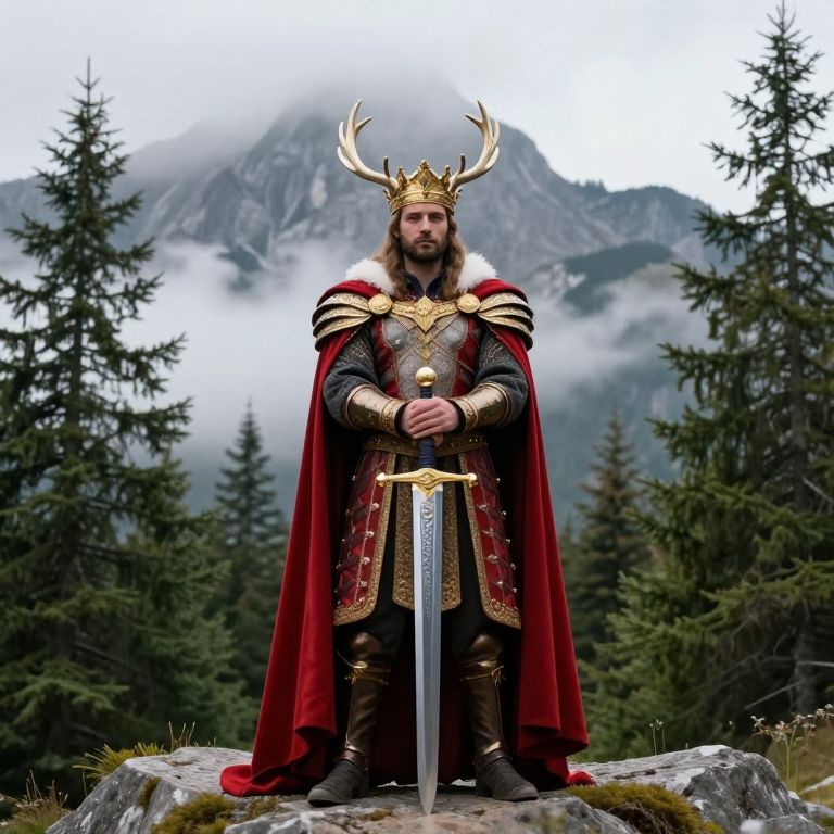 Regal monarch stands resolute atop a mountain glen, donning a golden crown with antlers, a flowing crimson cloak, and ornate armor, gripping a sword while surrounded by towering evergreens and misty peaks.