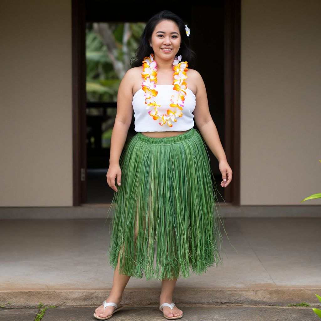 Lilo Costume Hula Skirt, woman in a grass skirt and flower lei lei is standing in front of a house