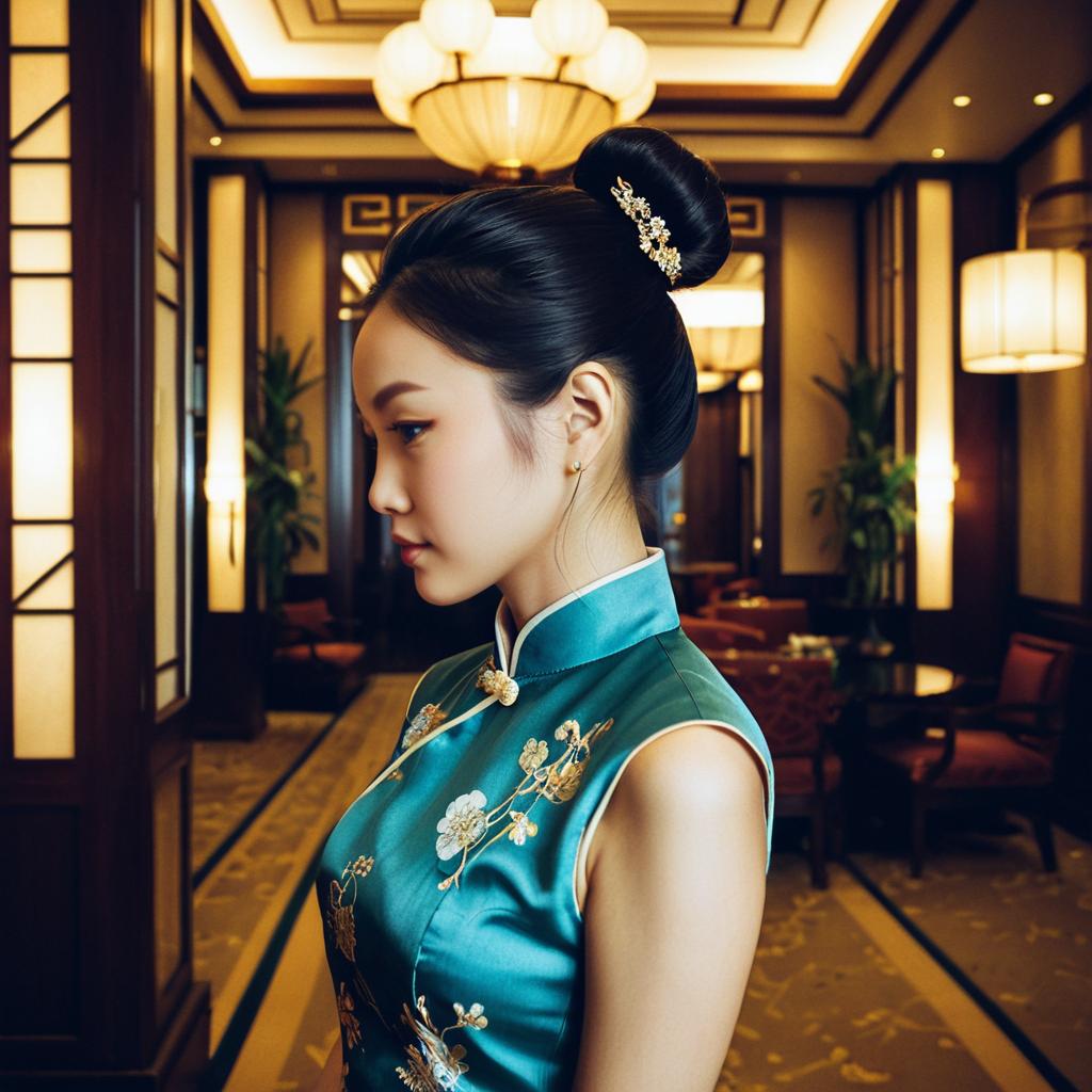 Side Bun hairstyle on asian woman, wearing silk cheongsam, in luxury hotel lobby, captured in fashion editorial style with soft ambient lighting.