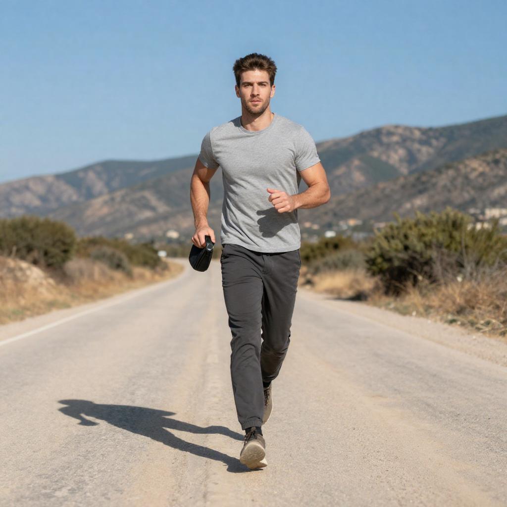 Photograph of a muscular man with short brown hair, wearing a gray t-shirt and dark gray pants, running on a deserted, sunlit road with dry, beige dirt shoulders. He carries a small black bag in his right hand. The background features a mountainous landscape with green shrubs and a clear blue sky.