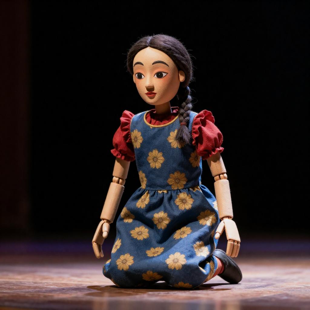 Photograph of a puppet with dark, ured face and braided hair, wearing a blue dress with yellow floral patterns and red ruffled sleeves, kneeling on a wooden stage. The puppet is illuminated by a spotlight, creating a dramatic contrast against the dark background.