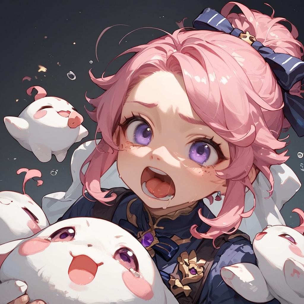Score_9, score_8_up, score_7_up, source_anime, doro, creature, :3, chibi, aquascreaming, screaming, open mouth, crying with eyes open, pink hair, purple eyes, hair bun, hair bow, no humans, white skin