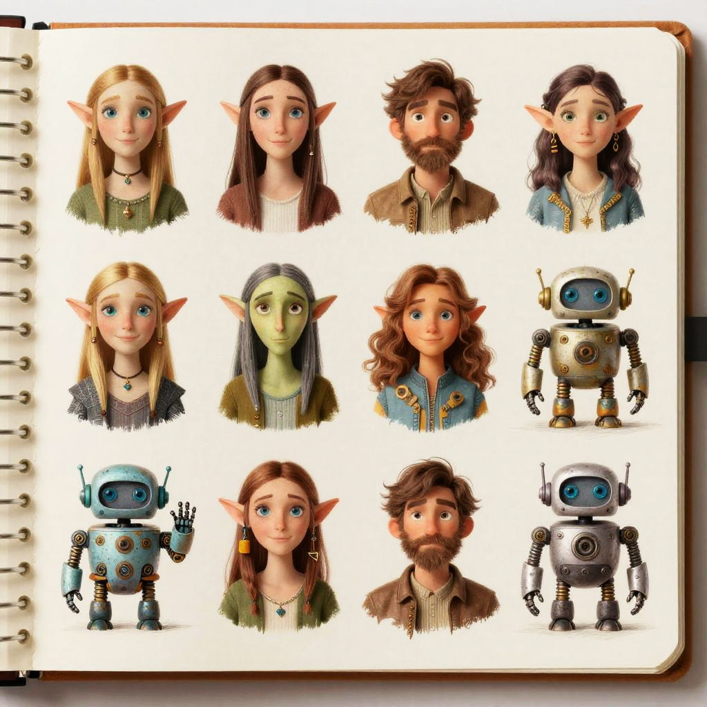 Characters to draw generator showing a mix of whimsical and realistic character designs, including humans, elves, and robots, each with distinct personalities and detailed textures, surrounded by sketchbook pages and creative tools in soft lighting.