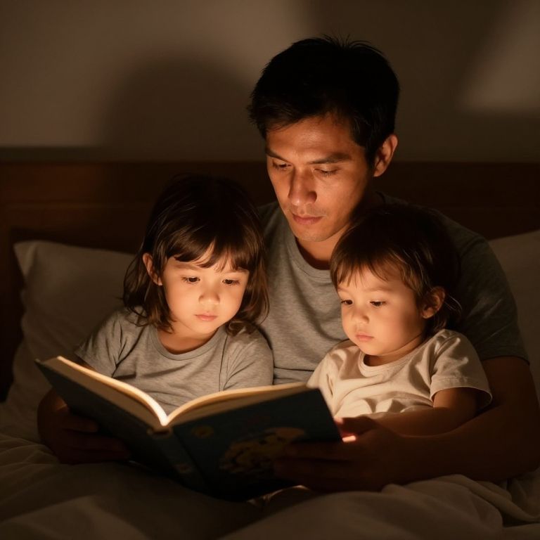 Daddie sitting on a rustic wooden bench in a cozy park, reading a book to a small child, gentle afternoon sunlight, surrounded by blossoming flowers and green foliage, peaceful and tender moment, cinematic lighting, sharp focus