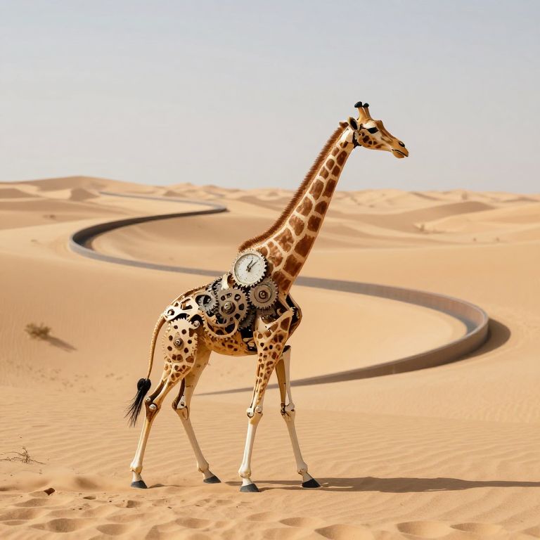 A clockwork giraffe with gears forming its bones walks backward through a desert that bends into a Möbius strip.