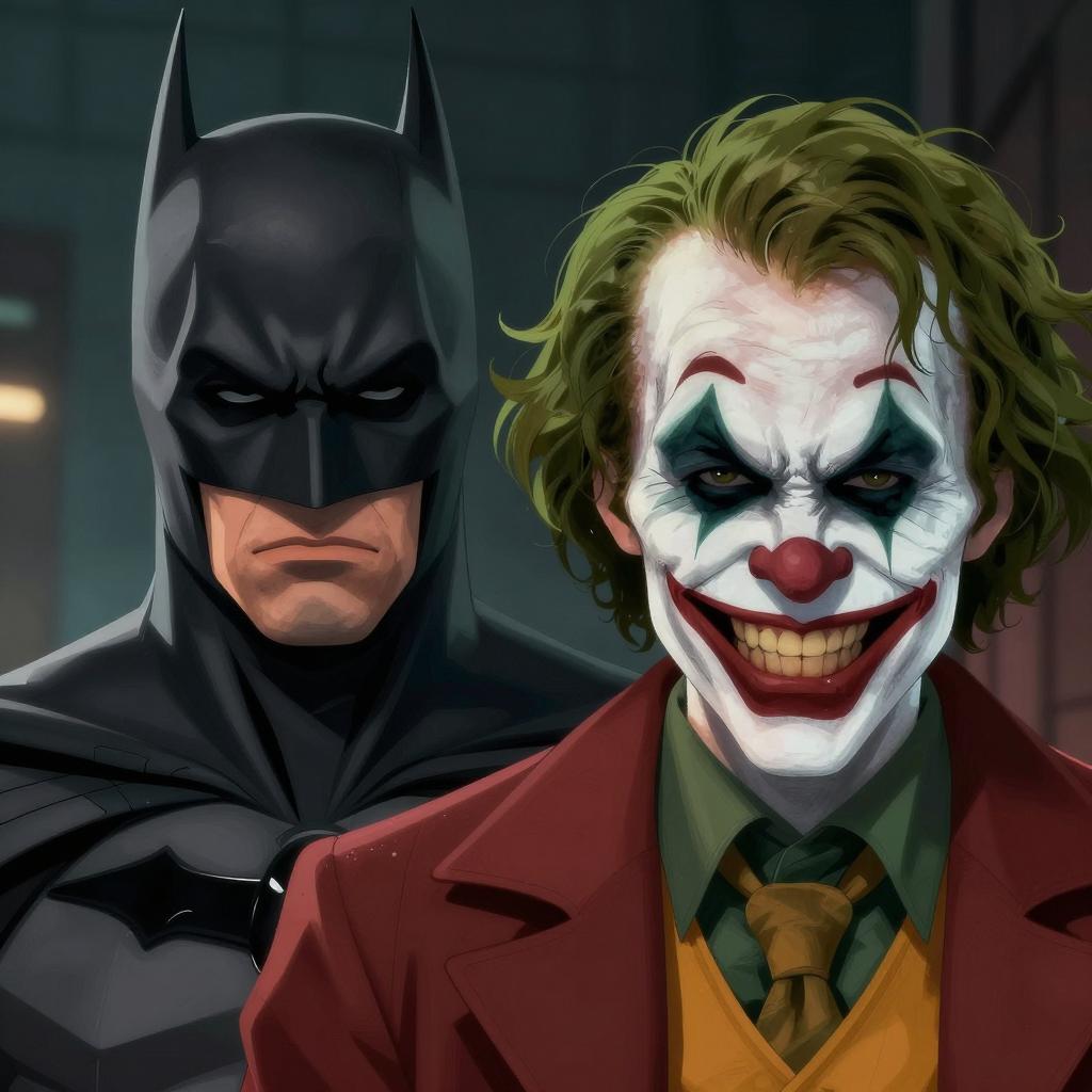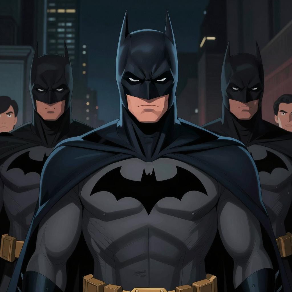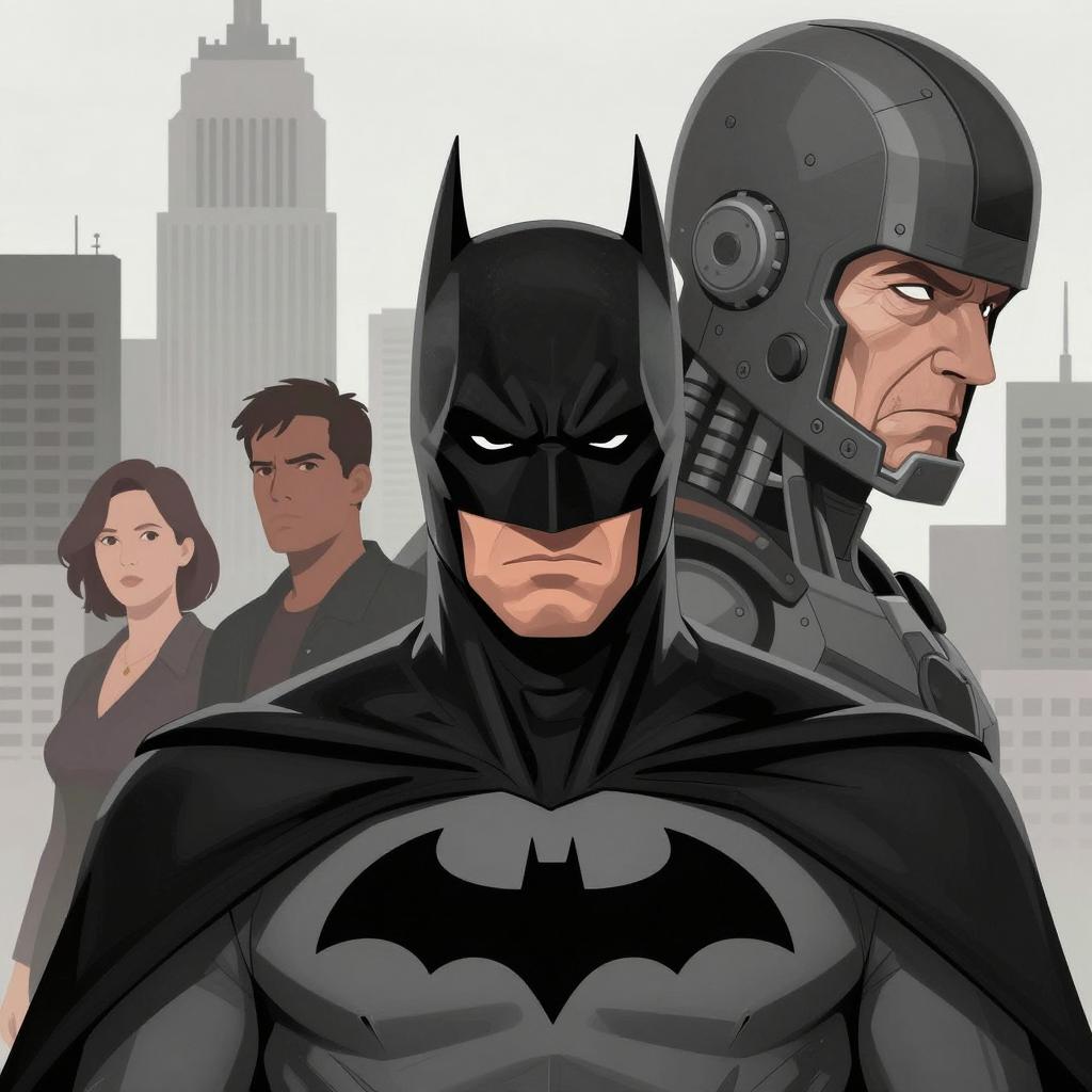 Digital illustration of Batman in front, wearing a dark gray batmask and suit, with serious expression. Behind him, a grayscale statue of a stern-faced man with a helmet. Dark, cloudy sky background. Cityscape with tall buildings in the distance. Batman in the foreground, statue slightly behind and to the right. Two people, one human, one statue.