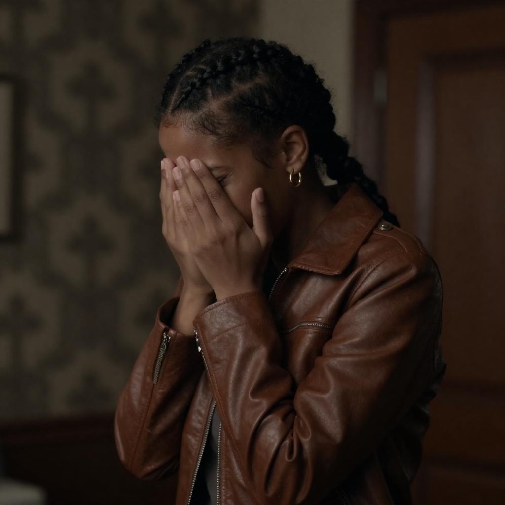 Woman with braided hair, wearing a brown leather jacket, and gold earrings, covers her face with both hands in a distressed pose. Dark, patterned wallpaper and a wooden door in the background. Dim, moody lighting. Profile view, right side.