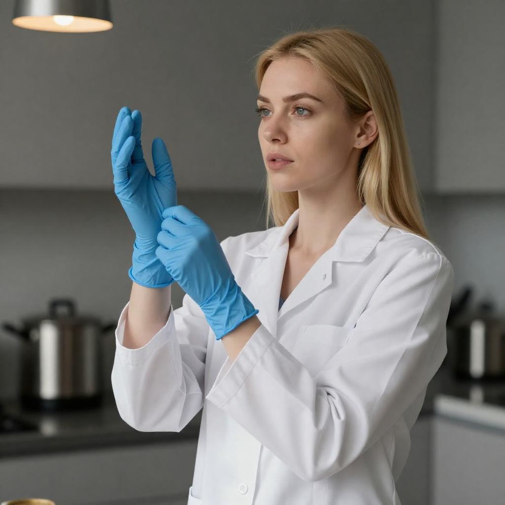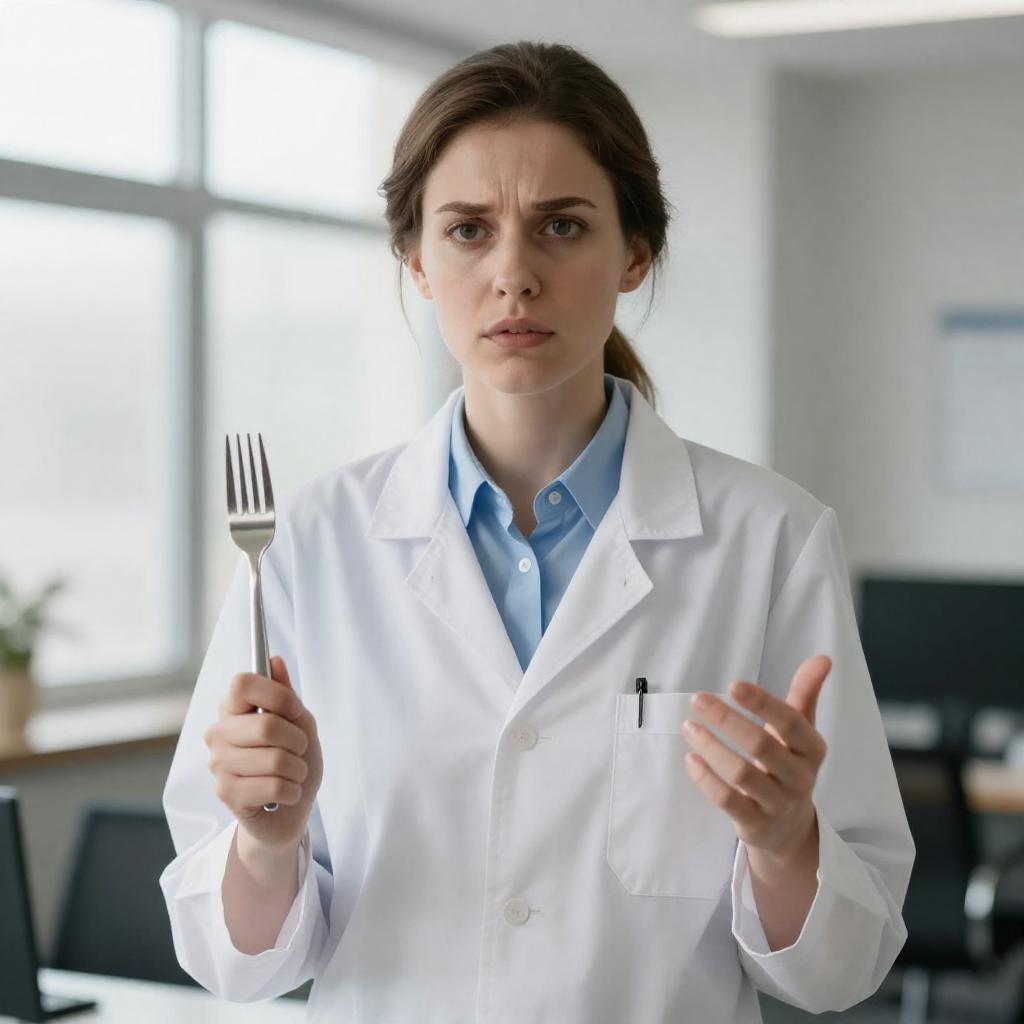Serious Lab-Coat Woman Gesturing with Fork