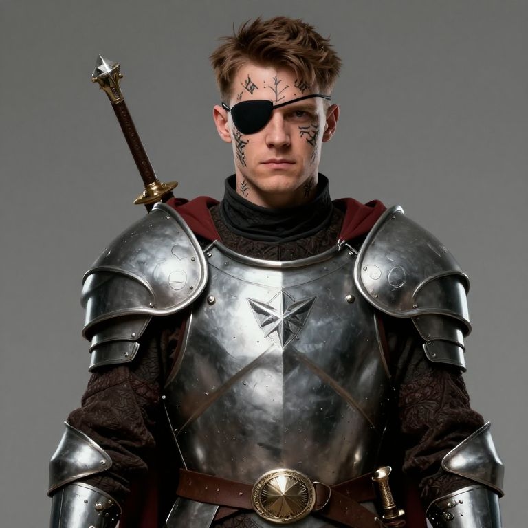 Holden Caulfield dnd character art by Timkongart A Goliath male with symmetrical face tattoo, dressed in cleric armour, with an eyepatch on his left eye,