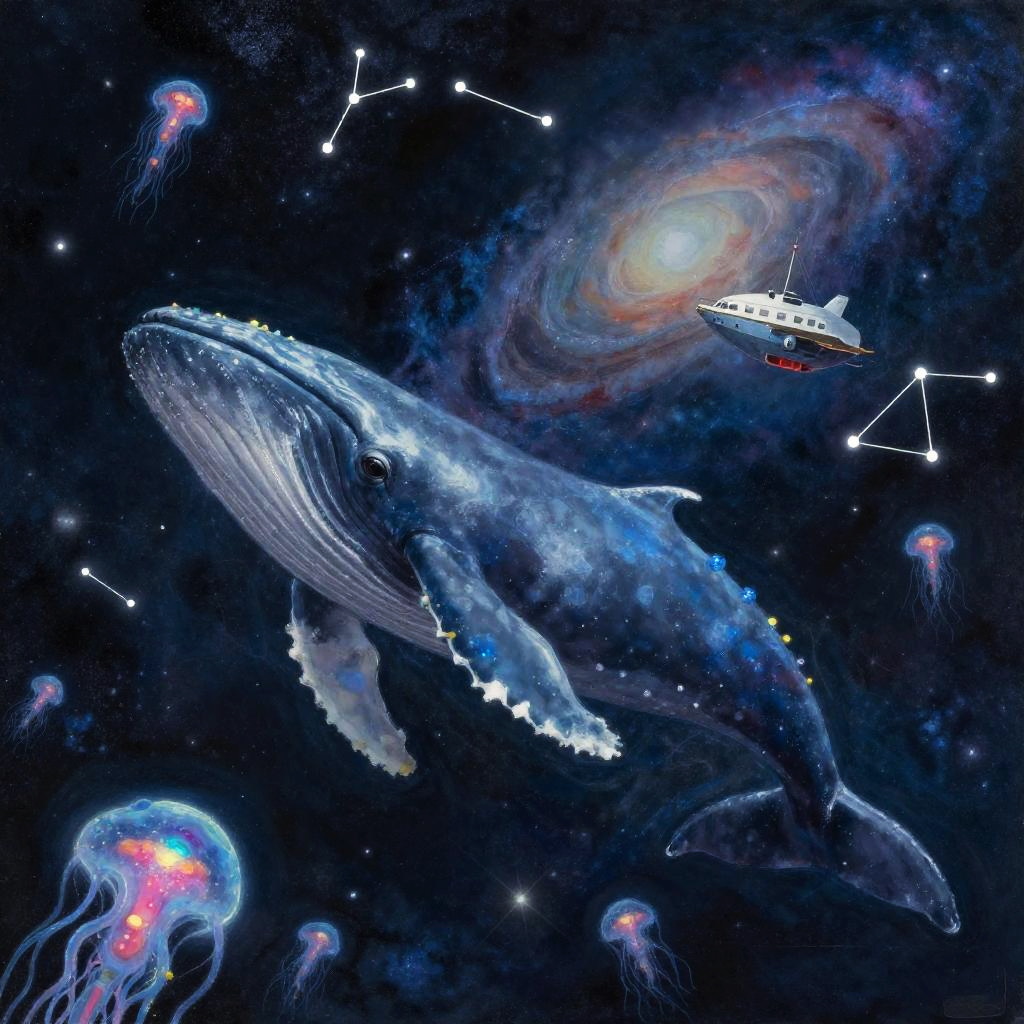 Artistic gouache painting depicting a luminous celestial whale swimming through a star-strewn cosmic ocean. Surrounding the whale are swirling constellations, glowing bioluminescent jellyfish-like plankton, and futuristic skyships drifting near distant galaxies. The image evokes a tranquil and wondrous ambiance with iridescent highlights illuminating the deep space environment.