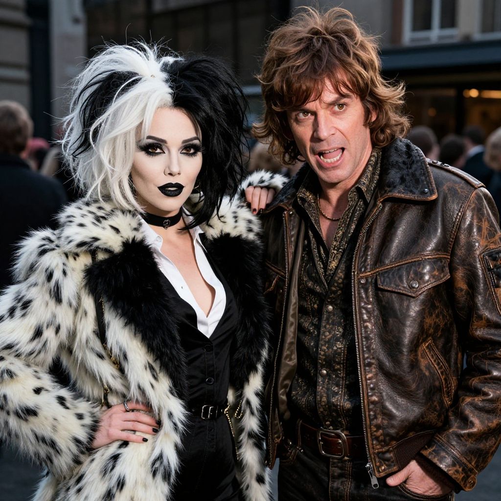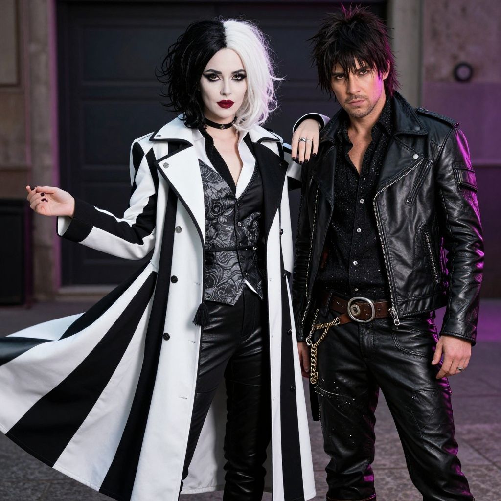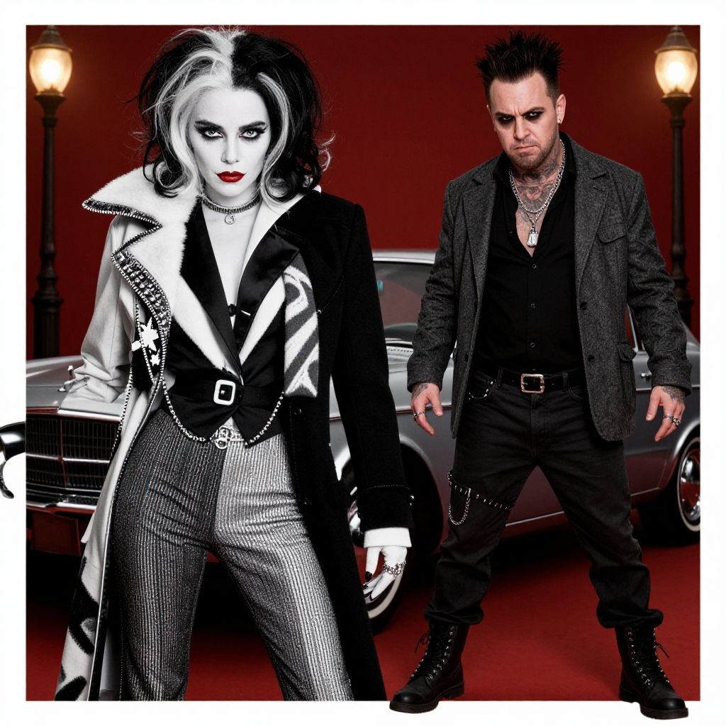 Cruella and Jasper costume duo inspired by vintage 1970s fashion, with dramatic black and white fur textures, Jasper in rugged leather with mischievous expression, high contrast lighting, cinematic street style, highly detailed character design.
